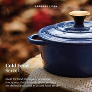 This Barbary & Oak 24cm casserole pan is a reliable cooking companion that any avid cook needs in their kitchen. Featuring a quality cast iron construction, this material is highly durable and is built to last a lifetime, making it perfect for those who love to make delicious casseroles for all the family. This material also helps retain the heat, keeping your food warmer for longer and providing even heat distribution for better cooking results. The quality enamel interior coating prevents food from sticking and burning, making it easy to clean after an intense cooking session. A domed lid is included, which helps lock in and retain all the moisture to ensure your food is tender with an enhanced flavour. The handle is ergonomically designed, providing you with a comfortable and safe grip when cooking or serving. Versatile in its design, this casserole pan is suitable for all hob types including induction.