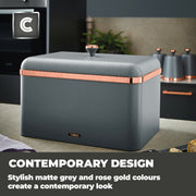 Wrapped in a staple design feature for today's modern home, the durable carbon build of this bread bin presents a reliable and highly styled storage compartment for your baked goods. The carbon structure is finished with a coating of matte grey, with rose gold tones for a tasteful finishing touch to compliment your kitchen environment. The removable bin lid provides maximum access to the inner compartment for easily retrieving of your breads and pastries. This bread bin measures H24 x W33 x D23cm and requires only a simple wipe clean to make for easy maintenance of its on-trend finish.