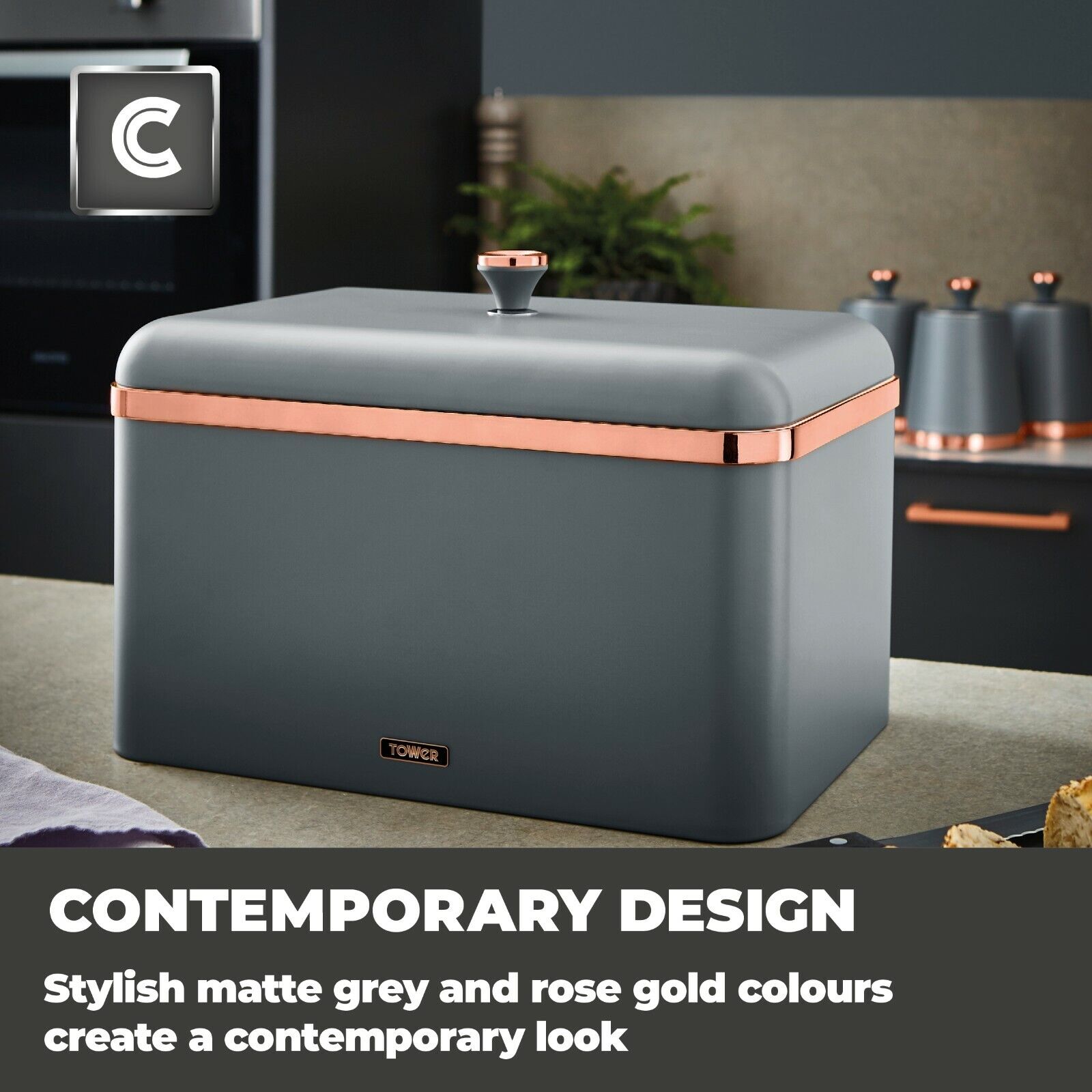 Brand New Tower Cavaletto Jug Kettle, 4 Slice Toaster, Bread Bin & Tea, Coffee, Sugar Canisters Matching Set in Grey & Rose Gold.