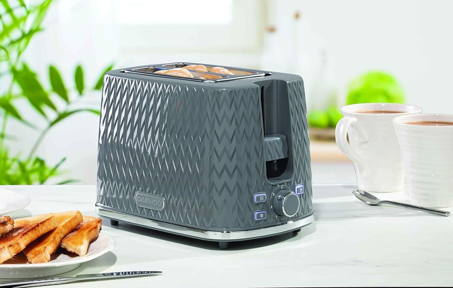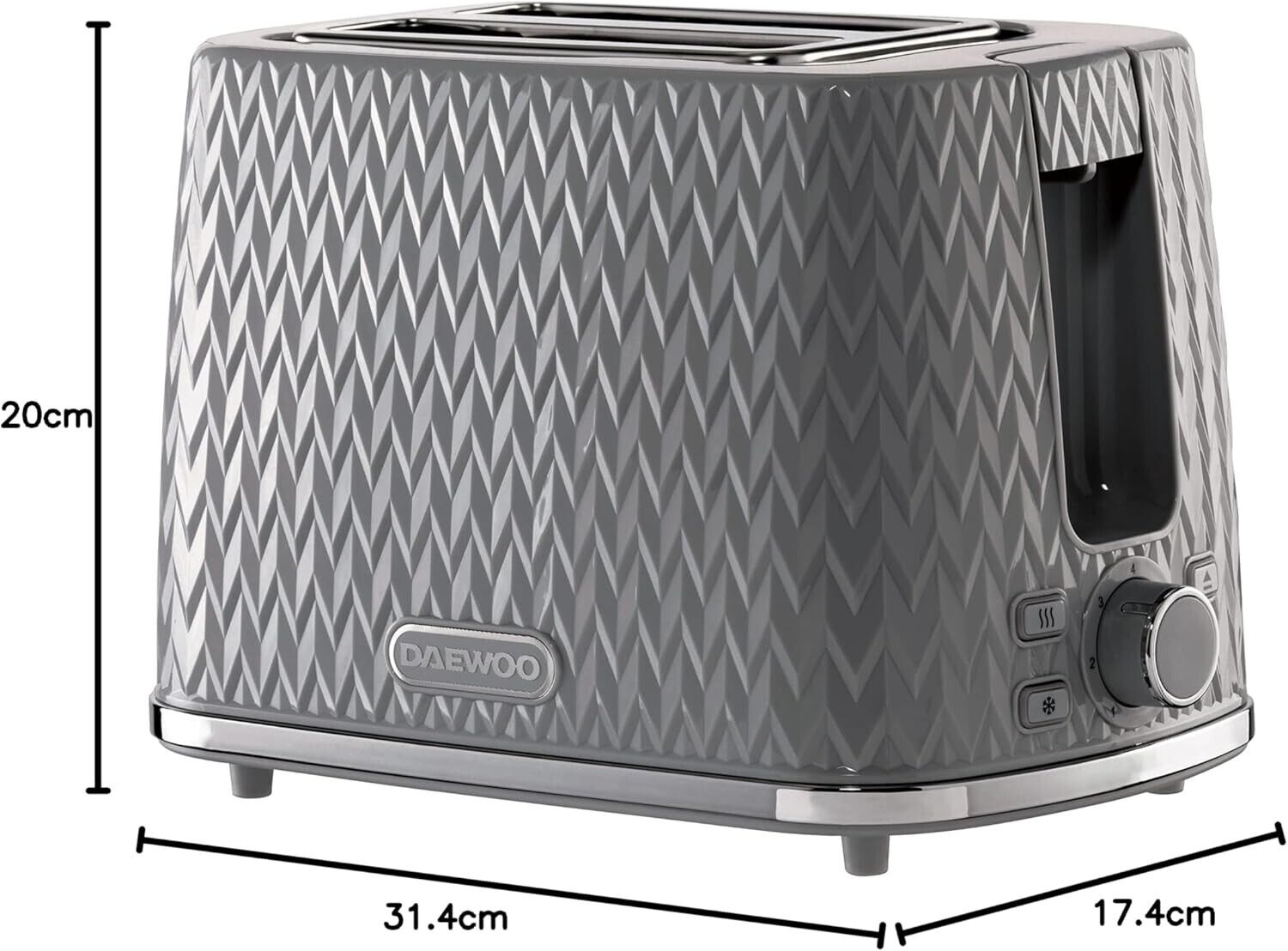 The Daewoo Argyle range has proved incredibly popular as a result of its distinctive and stylish textured body. Its diamond-patterned exterior means this 2-slice electric toaster is sure to look great in your kitchen.