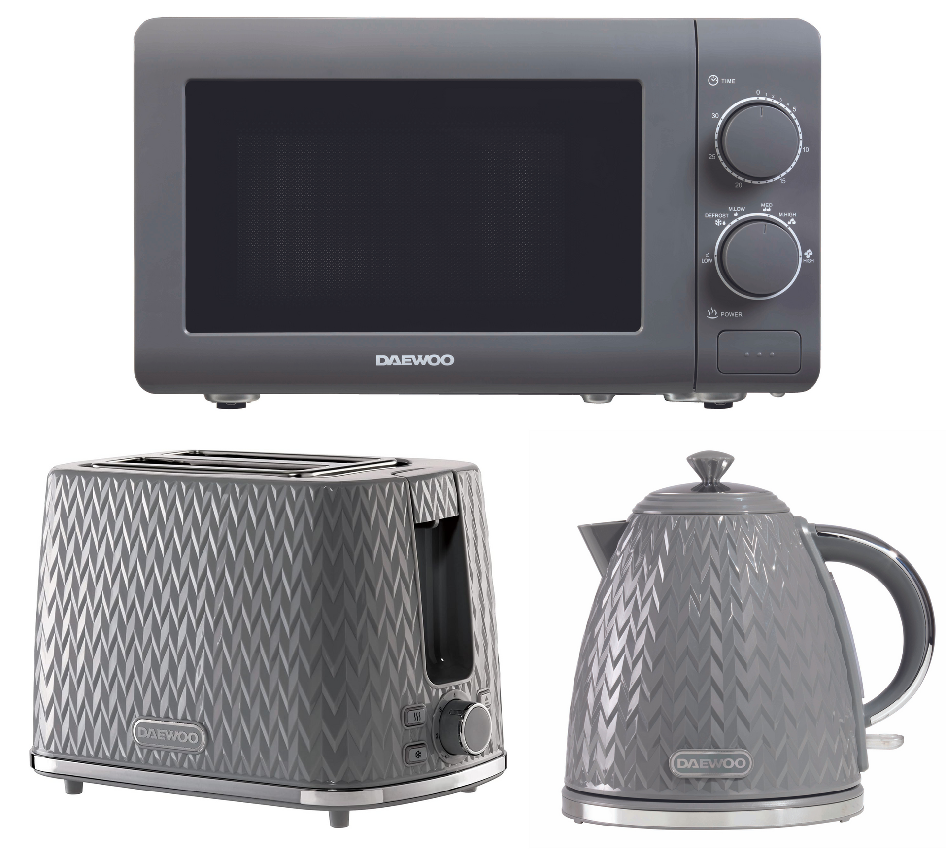 Daewoo Argyle Grey 1.7L 3KW Jug Kettle, 2 Slice Toaster & 800W 20L Manual Microwave SDA1961GE. Contemporary Matching Kettle, Toaster & Microwave Set in Grey