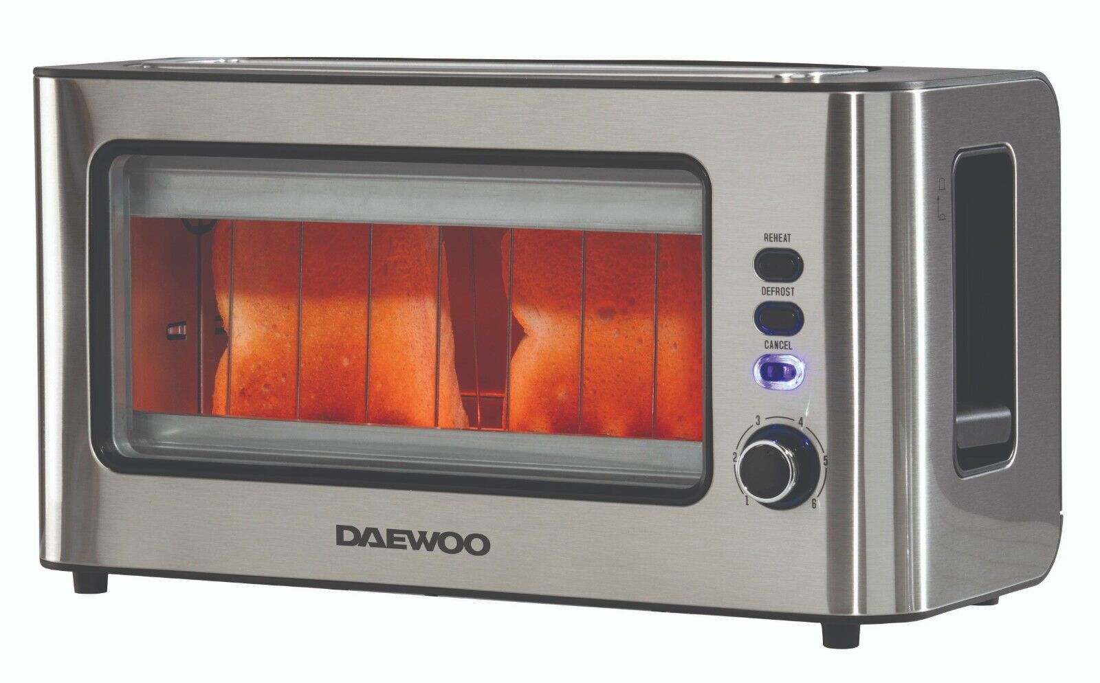 Introducing the Daewoo Two Slice Glass Toaster, featuring a chic, modern design with a clear glass viewing window for practicality and style. Toast 2 slices side by side in its ultra-wide slot, ensuring even browning. Enjoy 6 browning settings, defrost, and reheating options for versatile toasting. The toaster comes with a sunken high lift lever and an easy-to-empty crumb tray. The removable glass viewing window allows for easy cleaning, keeping the toaster looking crisp and smart. Upgrade your kitchen with this powerful 900W toaster, which also boasts a cool-touch exterior for added safety!