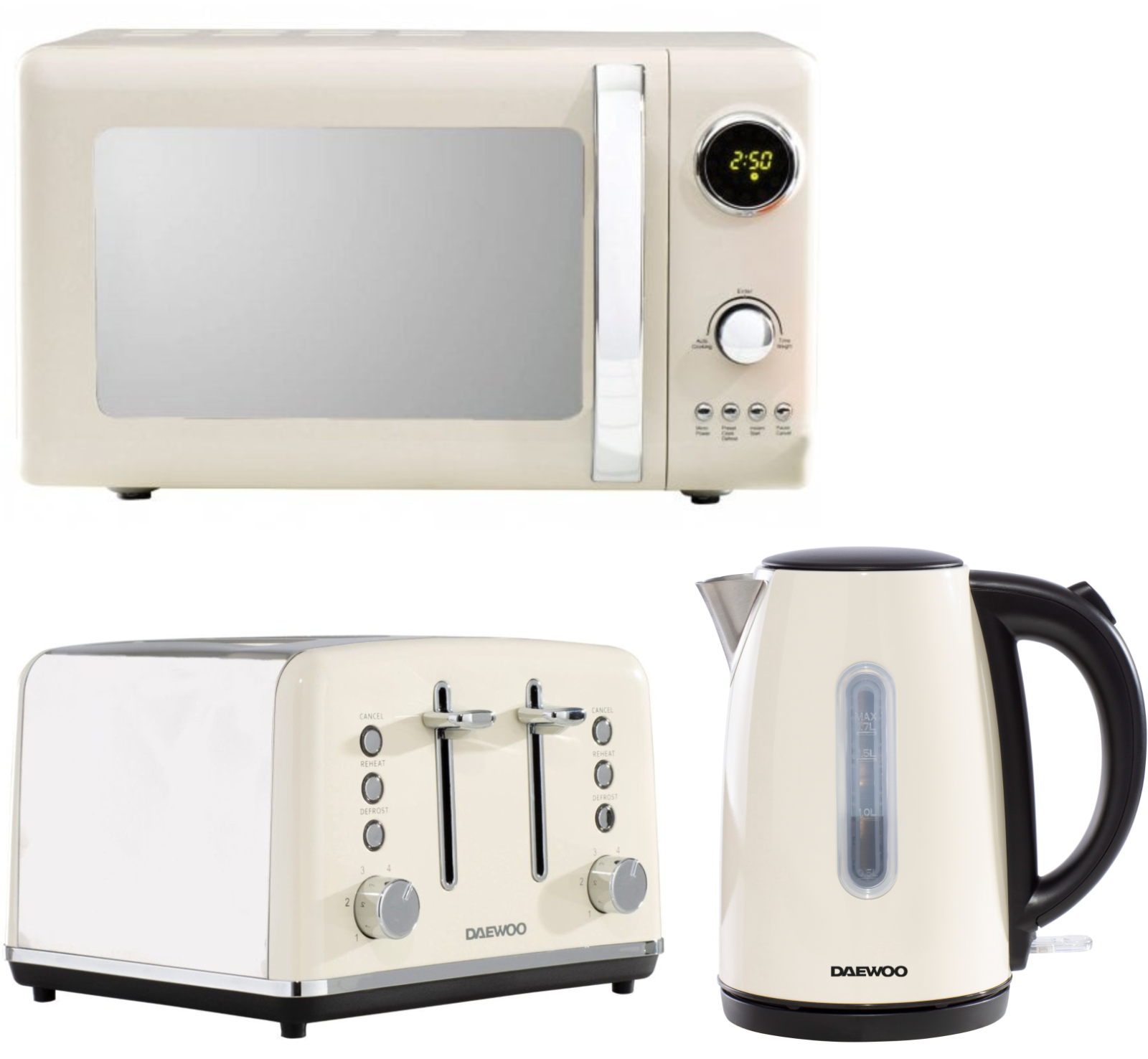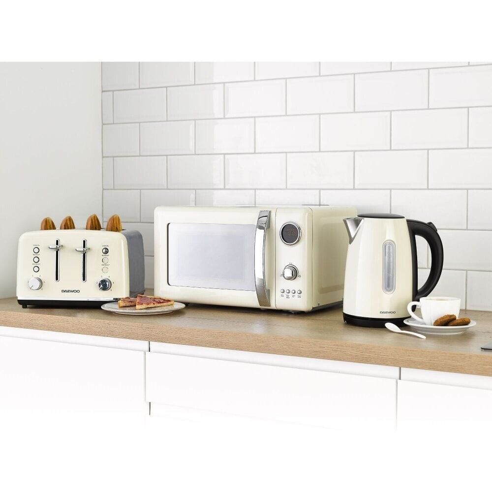 Daewoo Kensington Cream 1.7L 3KW Jug Kettle, 4 Slice Toaster & 800W 20L Digital Microwave Matching Kitchen Set