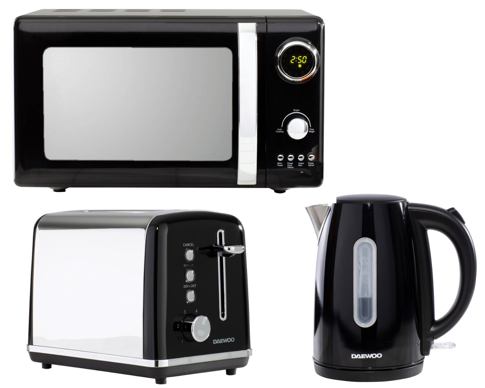 Daewoo Kensington Black 1.7L 3KW Jug Kettle, 2 Slice Toaster & 800W 20L Microwave Matching Set. Brand New UK Stock, Fast Dispatch & Free Next Working Day Delivery. Daewoo 3 Year Manufacturer Warranty