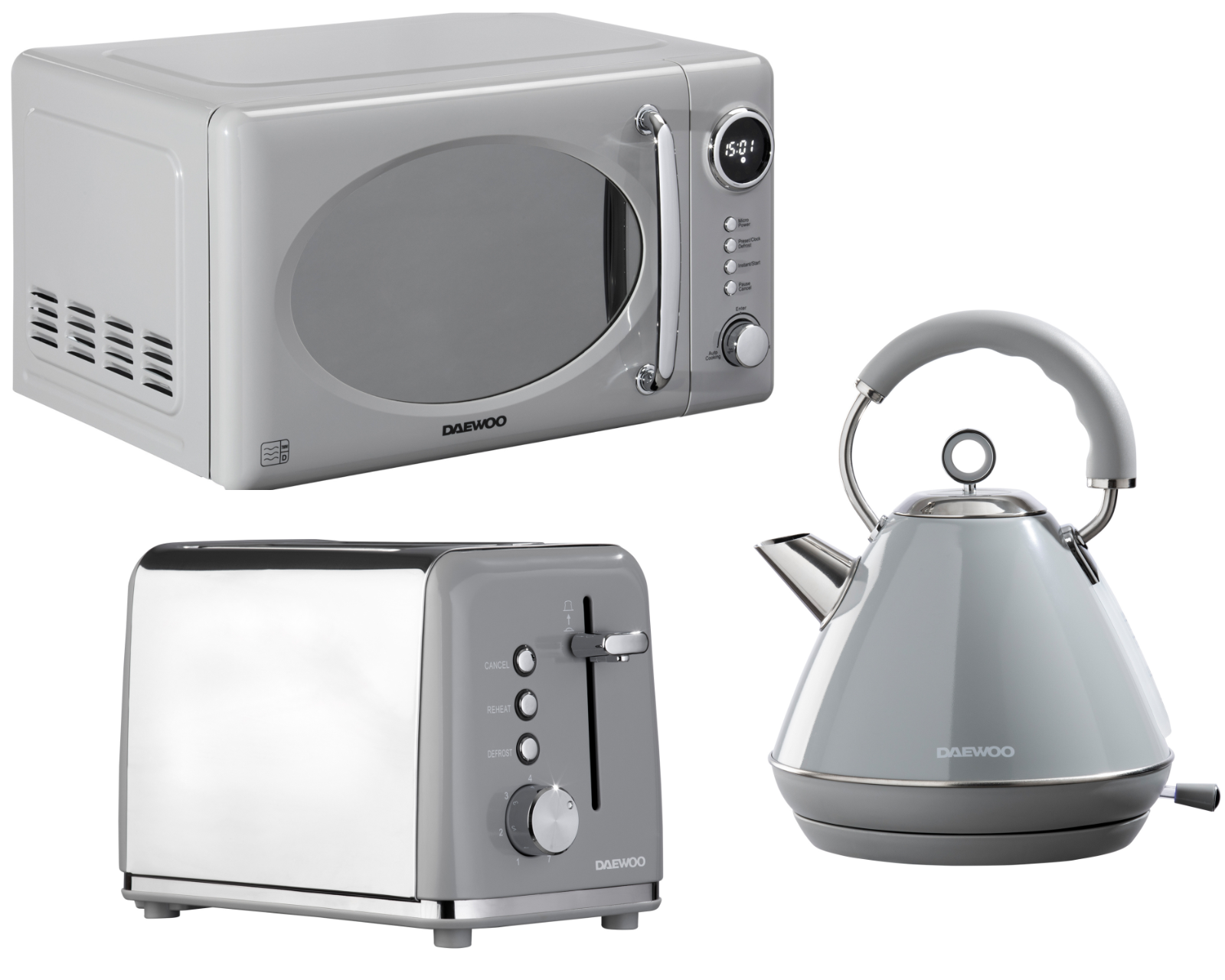 Daewoo Kensington Grey 1.7L 3KW Pyramid Kettle, 2 Slice Toaster & 800W 20L Microwave Matching Set. Brand New UK Stock, Fast Dispatch & Free Next Working Day Delivery. Daewoo 3 Year Manufacturer Warranty