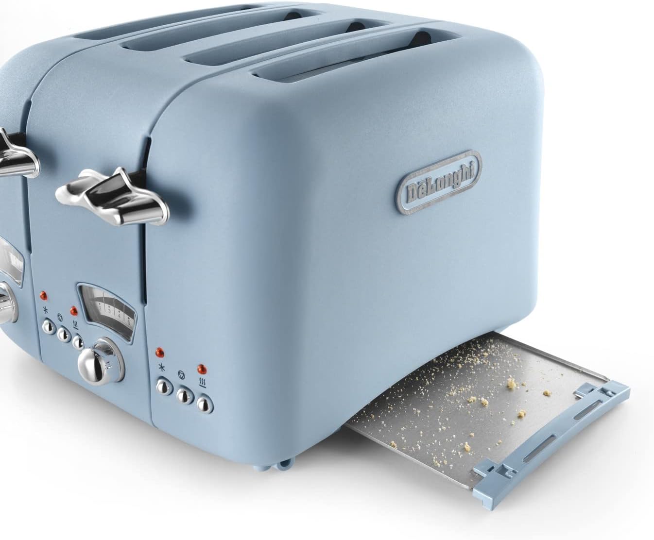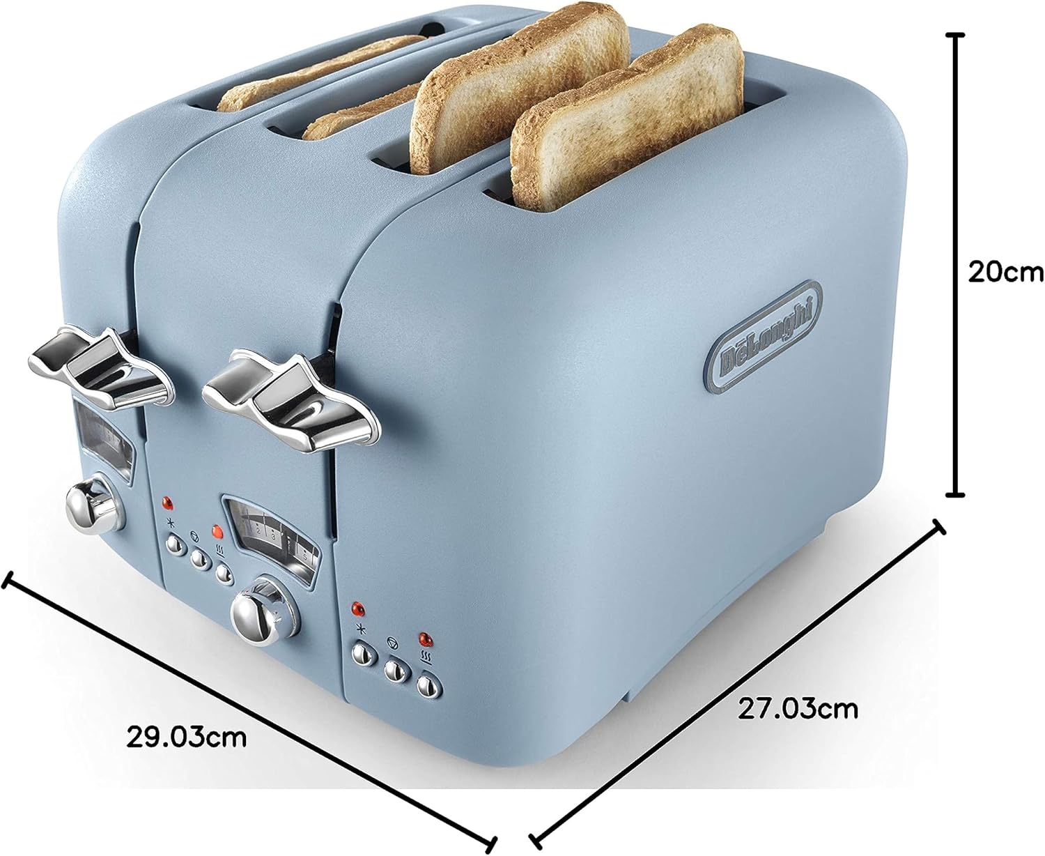 Bring a calm and stylish touch to your kitchen with the De’Longhi Argento Flora Blue 4-Slice Toaster. Its soft blue matt finish with chrome trims combines retro Italian design with modern convenience for perfect toast every time.
