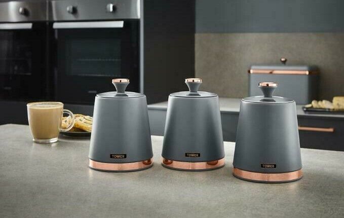 Brand New Tower Cavaletto Modern Kitchen Storage Set of 3 Canisters in Grey & Rose Gold. Perfect for storing Tea, Coffee & Sugar. Uk Stock,  Fast  Dispatch & Free Next Working Day Delivery. 3 Year Guarantee