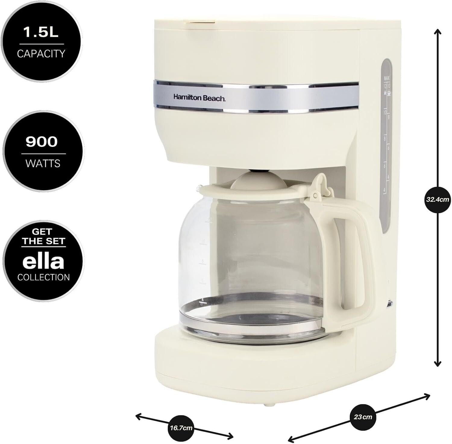 Discover the Hamilton Beach Ella 1.5L Filter Coffee Machine – your key to hassle-free coffee brewing with style. Boasting a large 1.5L capacity, it allows you to make up to 12 cups of coffee in a single brew. The removable Nylon coffee filter is both durable and washable, eliminating the need for paper filters. Benefit from the 60-second anti-drip function, keeping your kitchen mess-free. The water level indicator window allows you to view water levels and monitor filling without lifting the lid, ensuring a perfect coffee every time. The modern design, featuring sleek matte latte plastic housing, adds a stylish touch to any kitchen.