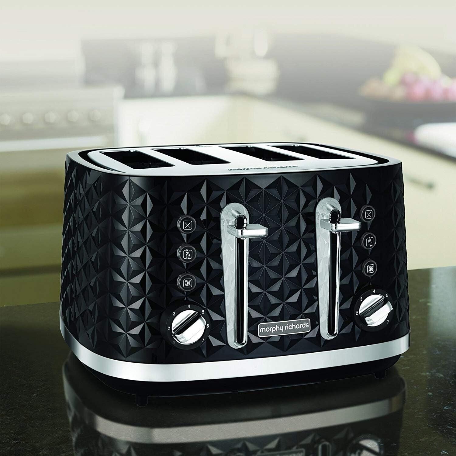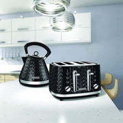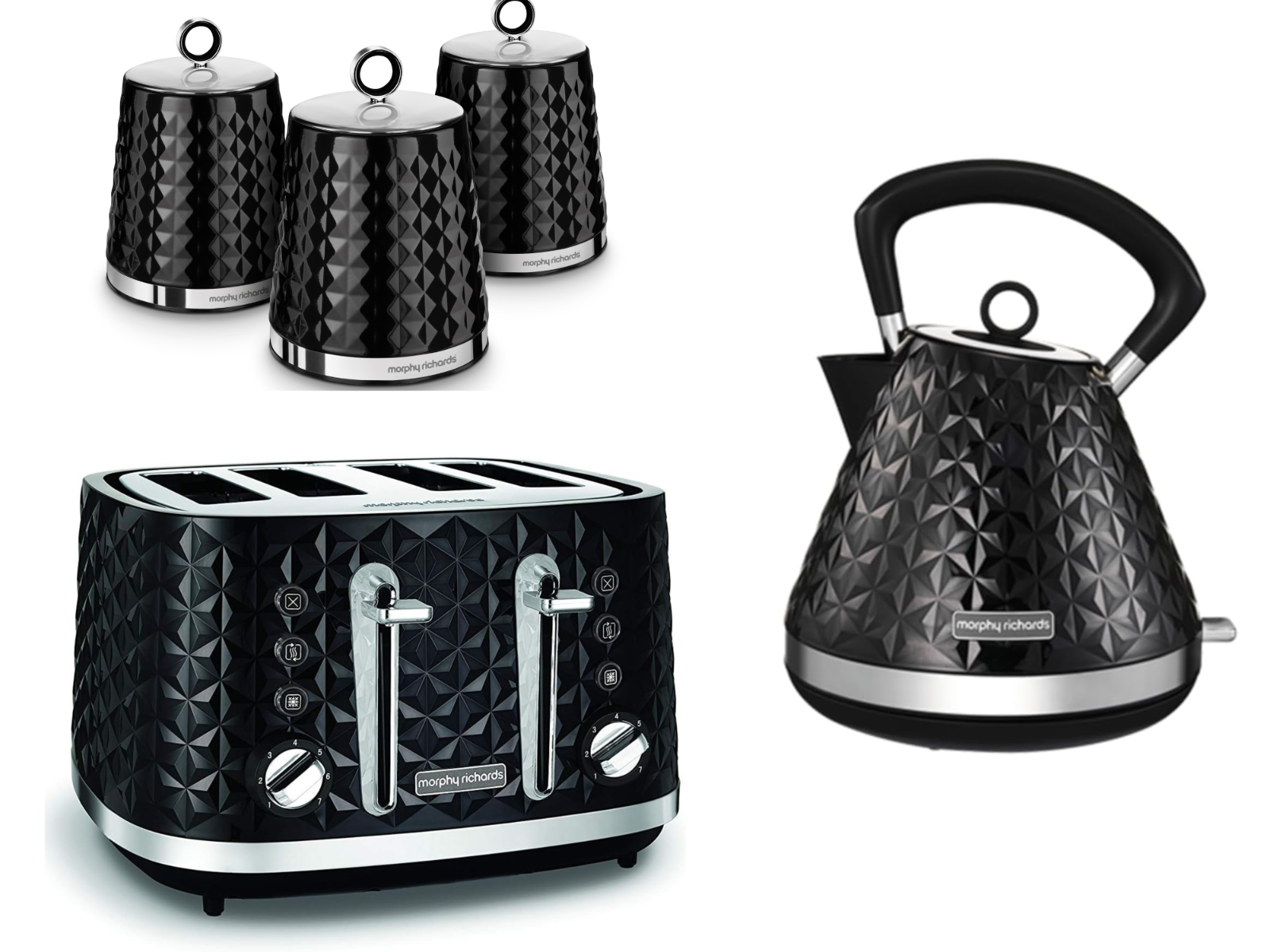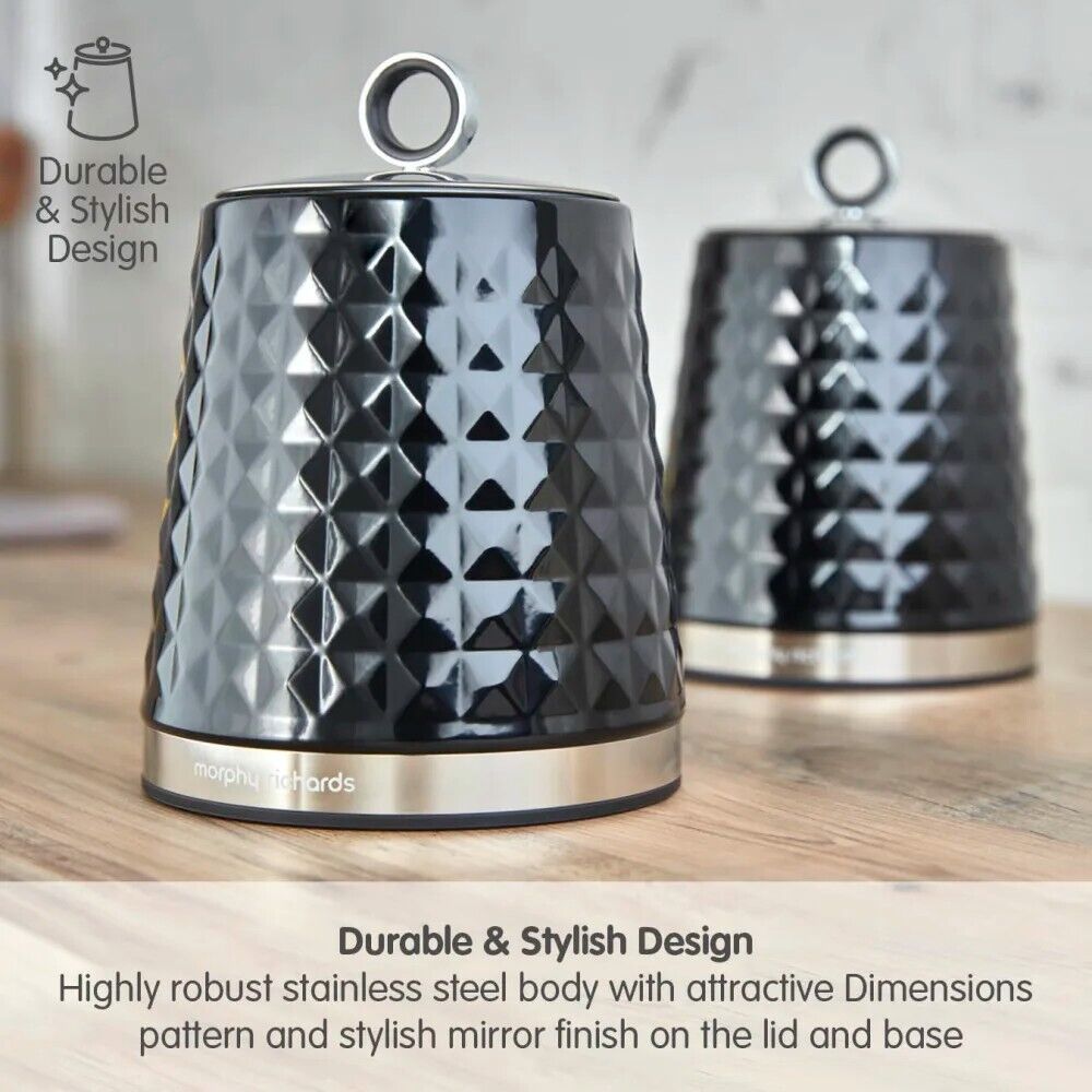 Morphy Richards Black Vector 1.5L 3KW Pyramid Kettle, 4 Slice Toaster & Dimensions Canisters Matching Kitchen Set