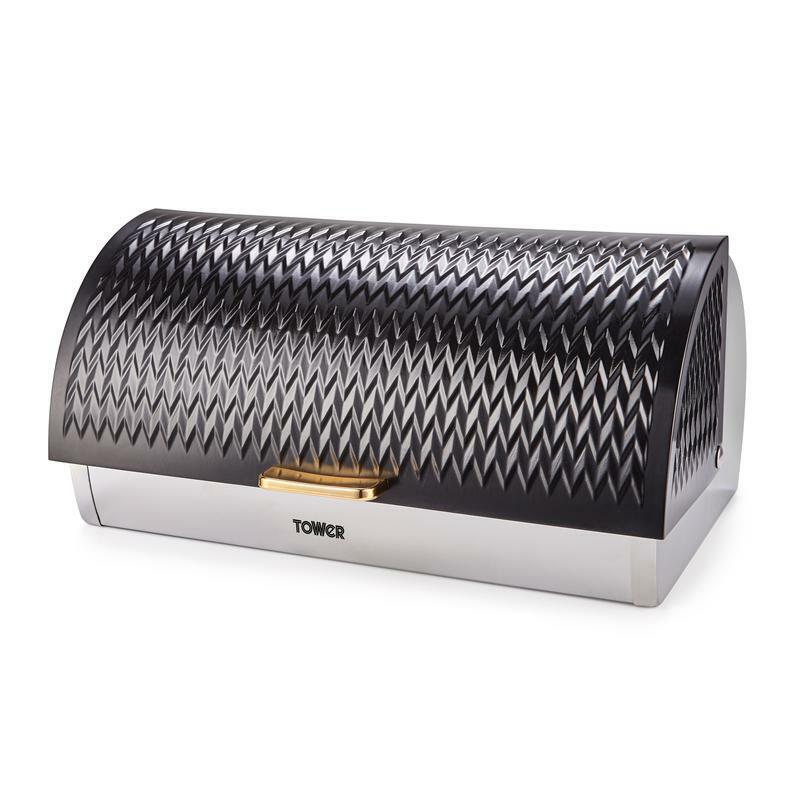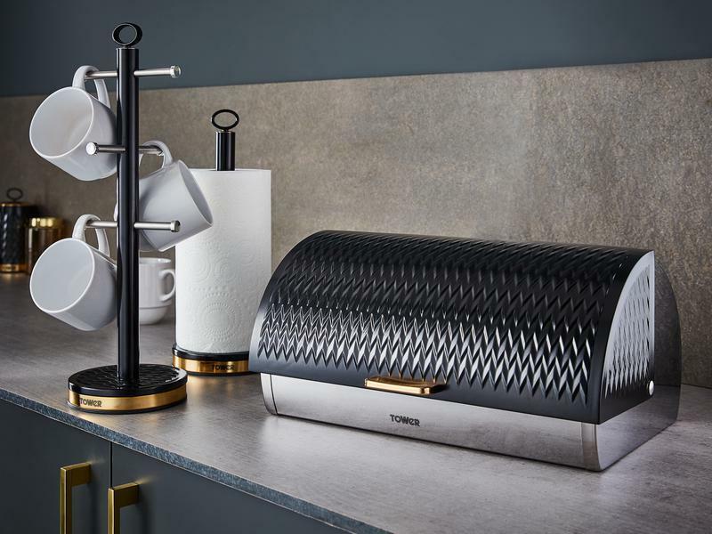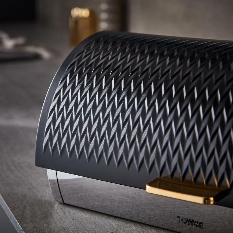 Brand New Tower Empire Roll Top Bread Bin and Set of 3 Canisters in Black with Brass Accents. Ideal Kitchen Storage for Bread, Pastries, Tea, Coffee & Sugar. New UK Stock, Free Next Working Day Delivery