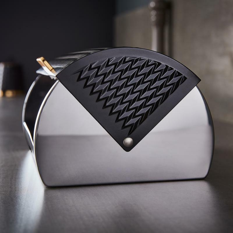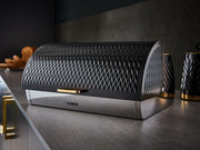 Tidily store your baked produce away within the durable structure of this bread bin. Supporting a roll top lid to grant access to the contents inside, the quality stainless steel material features a black coated V shaped texturing to the roll top lid to add a splash of style across your kitchen side. The large capacity provides plenty of storage space to easily fit a variety of sized loaves, bagels, crumpets and muffins, complete with ventilation holes across the main body so your perishables remain fresher for a longer period of time. The durable metal design is also easy to clean, requiring just a simple wipe down with a damp cloth to maintain.