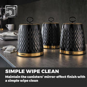 This set of 3 Empire canisters is the perfect way to store your tea, coffee and sugar on your kitchen counter top. Each canister features a stylish black body complimented by a mirrored finish lid with a unique V shaped pattern and topped off with polished elegant bronze accents around the base, providing an eye-catching addition to your kitchen decor. The capacity for each canister is 1.3 litres, which will ensure your contents will last a significant amount of time. The lids have been designed to include a large hoop that makes the canisters easier to open. They are also easy to maintain, requiring just a simple wipe to clean in order to maintain the quality finish.