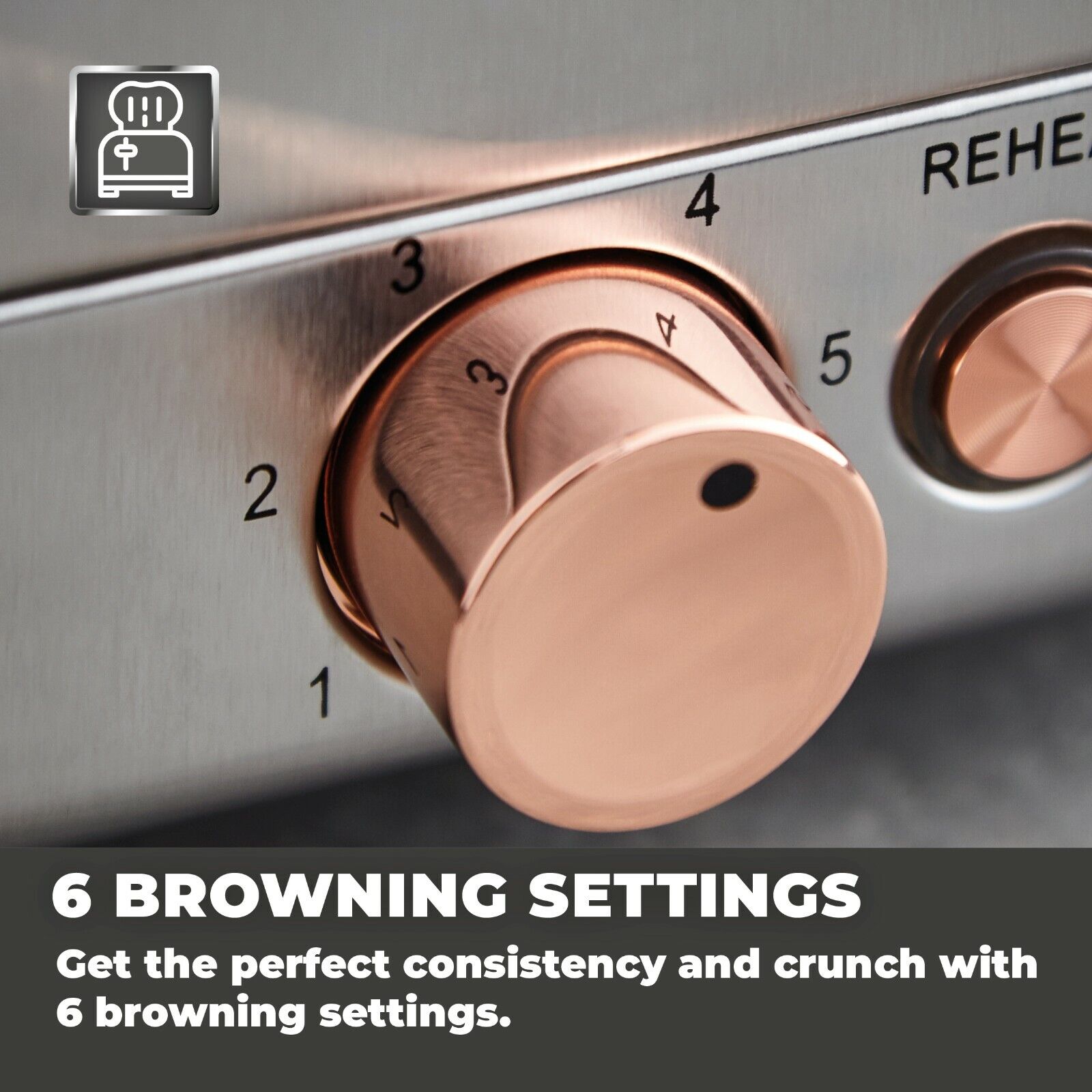 Combining pink and rose gold with a durable stainless steel finish, this Cavaletto 4 slice toaster injects a splash of contemporary design into your breakfast routine. The variable browning controls let you select the perfect toasting texture to suit your taste. Defrost, reheat and cancel options put you in control of the toasting cycle, so you can warm up your snacks or toast straight from frozen. The removable crumb tray captures any excess crumbs to make for easy disposal and to maintain the toaster's quality performance. The integrated cord storage keeps your counter surfaces free from trailing wires.