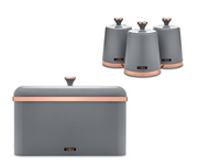 Tower Cavaletto Bread Bin & Tea, Coffee, Sugar Canisters Matching Kitchen Storage Set in Grey with Rose Gold Accents