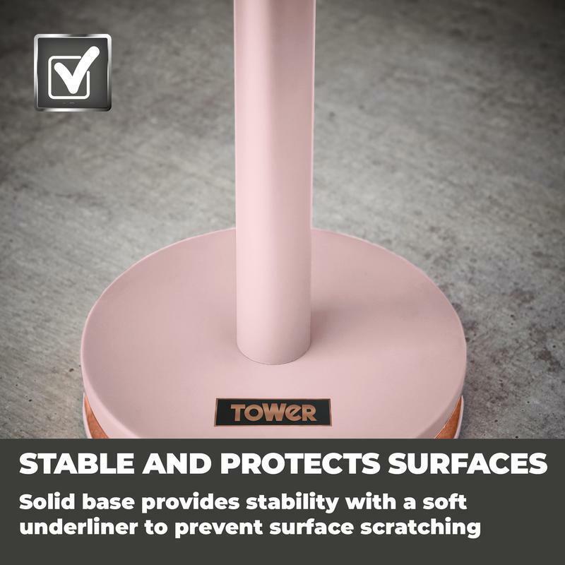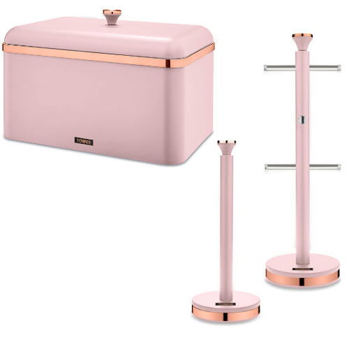 Brand New Tower Cavaletto Bread Bin, Mug Tree & Towel Pole Matching Set in Pink & Rose Gold. Free Delivery from UK Stock. Full 2 Year Manufacturer Guarantee