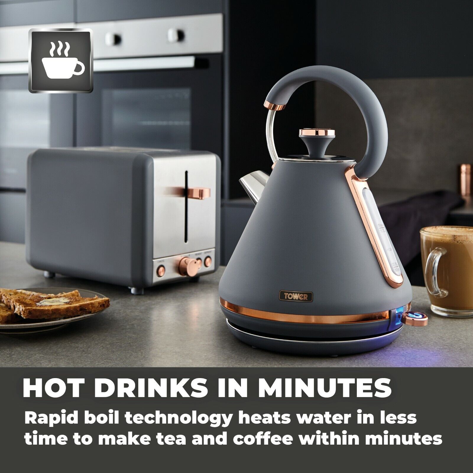 Brand New Tower Cavaletto 3KW 1.7L Pyramid Kettle, 2-Slice Toaster, Bread Bin & Tea, Coffee, Sugar Canisters Matching Set in Grey & Rose Gold. Fast Dispatch & Free Delivery from UK Stock. Full 3 Year Manufacturer Guarantee