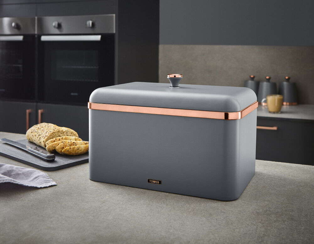 Wrapped in a staple design feature for today's modern home, the durable carbon build of this bread bin presents a reliable and highly styled storage compartment for your baked goods. The carbon structure is finished with a coating of matte grey, with rose gold tones for a tasteful finishing touch to compliment your kitchen environment. The removable bin lid provides maximum access to the inner compartment for easily retrieving of your breads and pastries. This bread bin measures H24 x W33 x D23cm and requires only a simple wipe clean to make for easy maintenance of its on-trend finish.