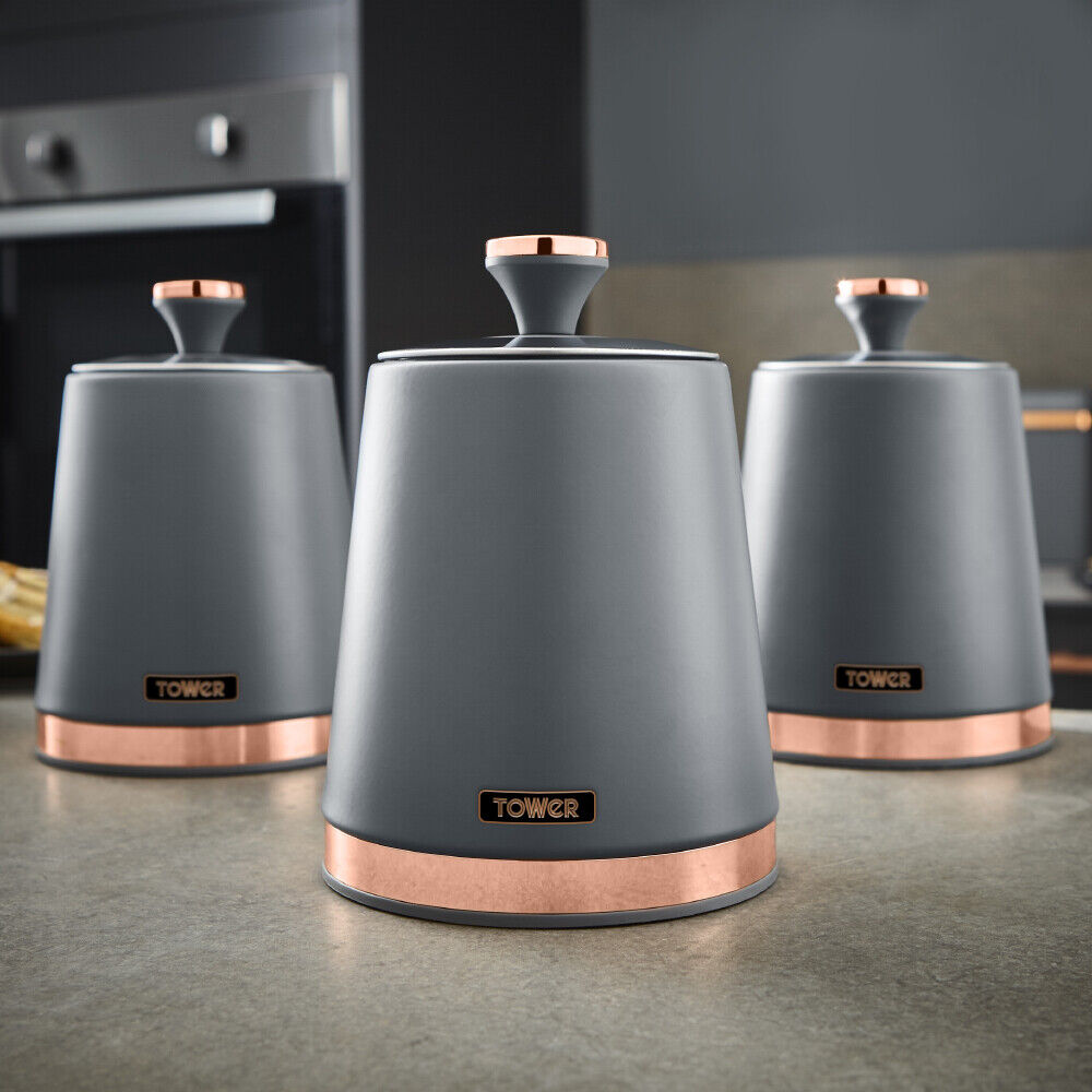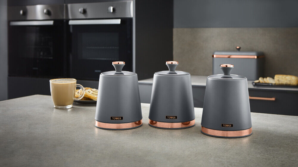 Wrapped in a staple design feature for today's modern home, the durable carbon build of these canisters locks in the freshness of your chosen ingredients, while presenting a reliable and highly styled storage compartment for your teas, coffees and sugars. The carbon structure is finished with a coating of matte grey, with rose gold tones for a tasteful finishing touch to compliment your kitchen environment. The removable lids provide maximum access to the inner capacity for easily retrieving of the contents stored inside. Each canister requires only a simple wipe clean to make for easy maintenance of its on-trend finish.