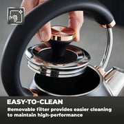 Brew your hot drinks with the 3kW concealed heating element that uses rapid boiling technology to efficiently heat your hot water in no time. The 1.7 litre capacity makes up to 7 cups from a single fill, with a water level indicator window so you can view the contents inside. The high quality stainless steel structure is finished in a black finish with rose gold finishing touches for a splash of elegance to set off your kitchen. The detachable filter can be easily removed when it requires a quick clean, while the pull up lid presents maximum access for ease of refilling. The automatic shut-off and boil dry protection features maintain reliable operation during use.