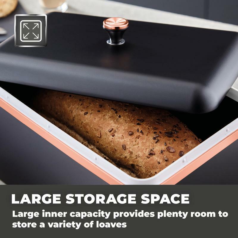 Wrapped in a staple design feature for today's modern home, the durable carbon build of this bread bin presents a reliable and highly styled storage compartment for your baked goods. The carbon structure is finished with a coating of matte black, with rose gold tones for a tasteful finishing touch to compliment your kitchen environment. The removable bin lid provides maximum access to the inner compartment for easily retrieving of your breads and pastries. This bread bin measures H24 x W33 x D23cm and requires only a simple wipe clean to make for easy maintenance of its on-trend finish.