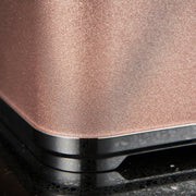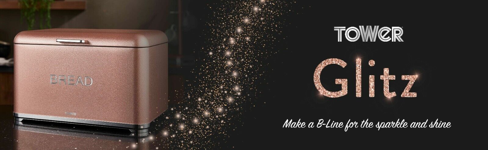 Add some glamour to your kitchen with this stylish blush pink bread bin from the Tower Glitz range. The sparkling glitter like design is complimented by a chrome base and handle, providing a contemporary look and feel that really makes a statement. Its rectangular shape and large capacity provides enough space to fit a wide range of different sized delicious baked goods, including bread, muffins and crumpets, all of which will be neatly stored away and kept fresh. The quality steel body adds an extra level of durability and remains stable on your kitchen countertop. This bread bin is also really easy to clean, requiring just a simple hand wipe so it can maintain the glamorous finish for years to come. It's time to make your kitchen feel fabulous.