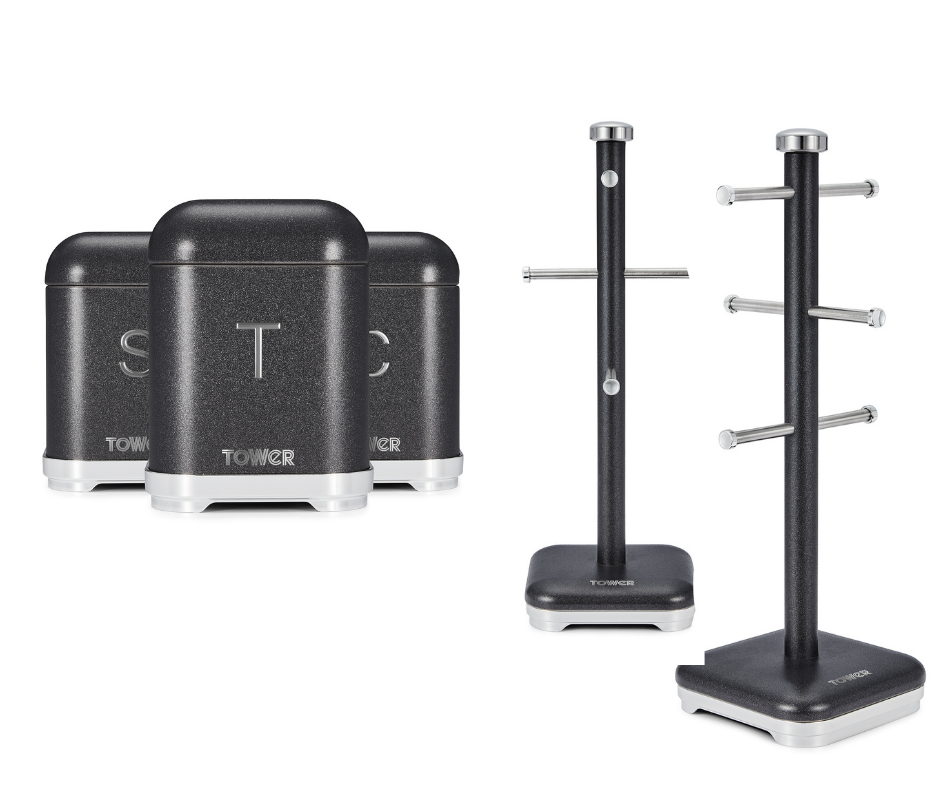 Tower GLITZ Canisters Mug Tree & Towel Pole Kitchen Set Sparkling Black Noir