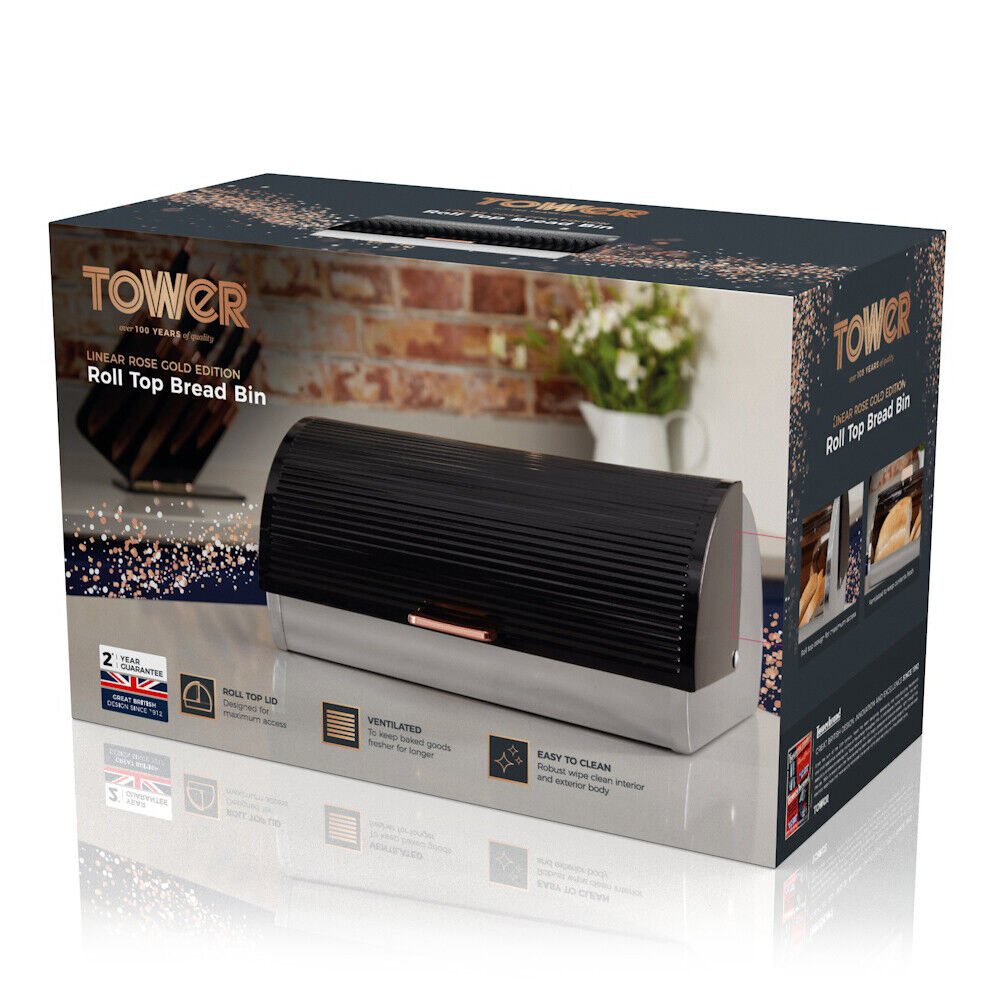 New Tower Linear Roll Top Bread Bin in Rose Gold & Black. Contemporary Storage for Bread & Pastries. Free Delivery, 2 Year Guarantee. UK Stock