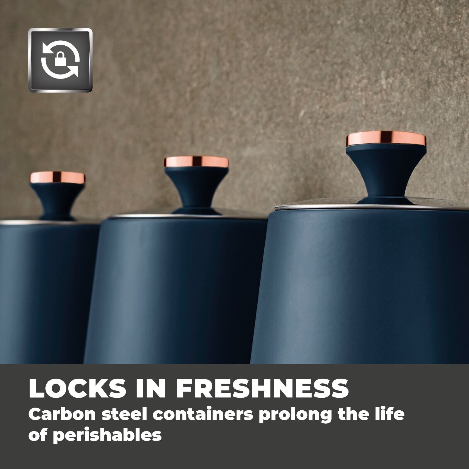 Wrapped in a staple design feature for today's modern home, the durable carbon build of these canisters locks in the freshness of your chosen ingredients, while presenting a reliable and highly styled storage compartment for your teas, coffees and sugars. The carbon structure is finished with a coating of Midnight Blue with rose gold tones for a tasteful finishing touch to compliment your kitchen environment. The removable lids provide maximum access to the inner capacity for easily retrieving of the contents stored inside. Each canister requires only a simple wipe clean to make for easy maintenance of its on-trend finish