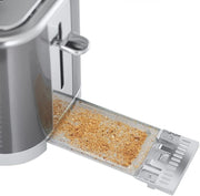 Make a statement in your kitchen with the Geo Steel 2 Slice Toaster that comes in a Gunmetal Grey Stainless Steel with Polished Accents. Its eye-catching and unique Textured Metal Design breaks new ground with the materials used as well as its geometric aesthetic. Adding a premium touch to your kitchen counter, this contemporary toaster will make a lasting impression, every morning at breakfast. Its Clear Illumination lights up when your toaster is on and toasting, whilst adding to its high-tech design. The toasters Wide Chassis means you can toast a wider selection of breads, letting you really enjoy those chunky slices that satisfy the most!