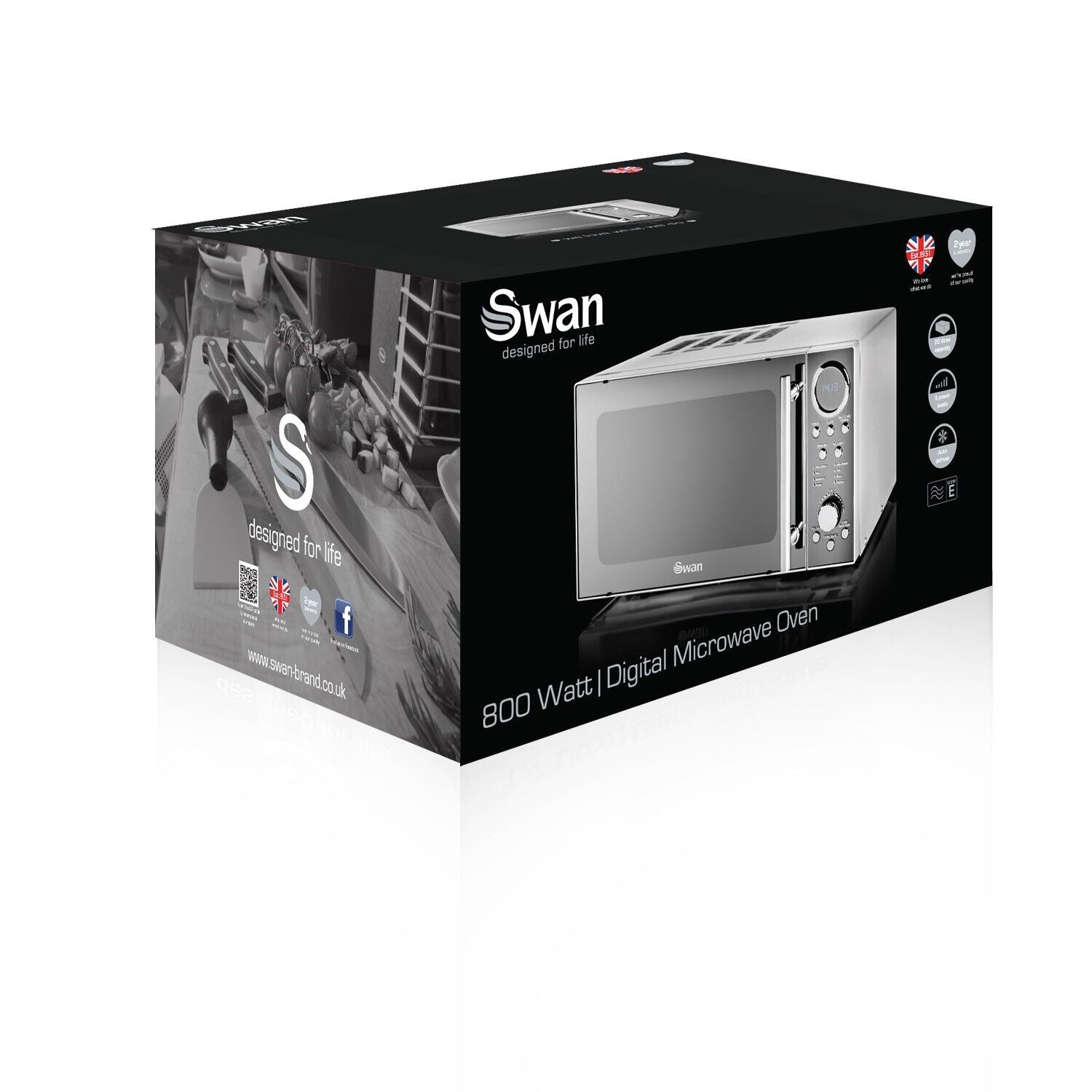 Want style and functionality in one, sleek , time-saving package? That'll be the Swan 800W Digital Microwave. Featuring a large 20 litre capacity and tempered glass turntable, this fantastic microwave oven has what it takes to efficiently handle all manner of dishes.10 easy to use programmes and a digital timer takes the rigmarole out of reheating, defrosting and cooking. A cooking end signal alerts you when your meal is ready and 5 power levels mean that every cooking eventuality is catered for.