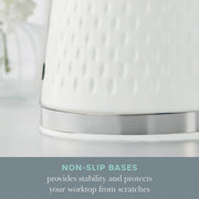 Introduce the Swan Elegance SWKA18533WHT set of 3 white storage canisters to your everyday kitchen collection. Each canister features a 1.3 litre capacity, letting you store large amounts of tea, coffee, sugar or other loose ingredients on your kitchen worktop, all while protecting the contents from dust or moisture. The lids include large sturdy steel loops to grip comfortably, providing you with easy access to the contents. All canisters have non-slip feet for added stability and to protect your worktop from scratches. These kitchen canisters combine practicality with an elegant design, offering a contemporary colour scheme to fit perfectly amongst any kitchen decor. The canisters form part of the Swan Elegance breakfast and storage collection. Swan has been providing high-quality household appliances and kitchenware to millions of homes across the UK for over 100 years.