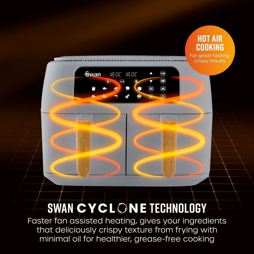 This Swan SD10410GRY Nordic grey dual basket digital air fryer is an energy saving alternative to oven cooking. Swan Cyclone Technology creates crispy fried meals with minimal oil needed for healthier results. Features 13 pre-set functions for Fries, Bake, Dehydrate and more. Smart Finish cooks two foods at once on different times and temperatures, while Match Cook syncs both baskets to cook on the same settings. Swan Nordic is inspired by Scandinavian minimalist design.