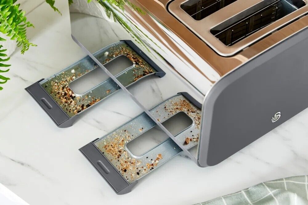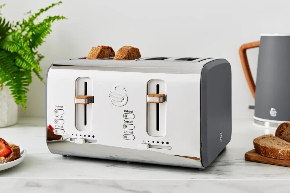 Start your morning off right with a delicious breakfast using the Swan Nordic ST14620GRYN grey 4-slice toaster. Whether it's toast, muffins, crumpets or bagels, get perfect results customised to your liking thanks to six adjustable browning levels. You can also toast four rounds at one time, perfect for a busy household. Toast gone cold? Just press the reheat button and your food will heat up without burning, ready to eat again. Freezing bread is a great money saver and food waste solution, but what if you fancy a quick snack? Just press defrost after the toast is pushed down and your bread will be ready to eat from frozen within minutes. To keep your kitchen worktop nice and tidy, this grey toaster features removable crumb trays to easily dispose of crumbs and integrated cord storage. Includes non-slip rubber feet for added stability. The Swan Nordic collection is inspired by Scandinavian minimalist design, featuring neutral colour schemes and wood-effect accents to compliment any home decor.