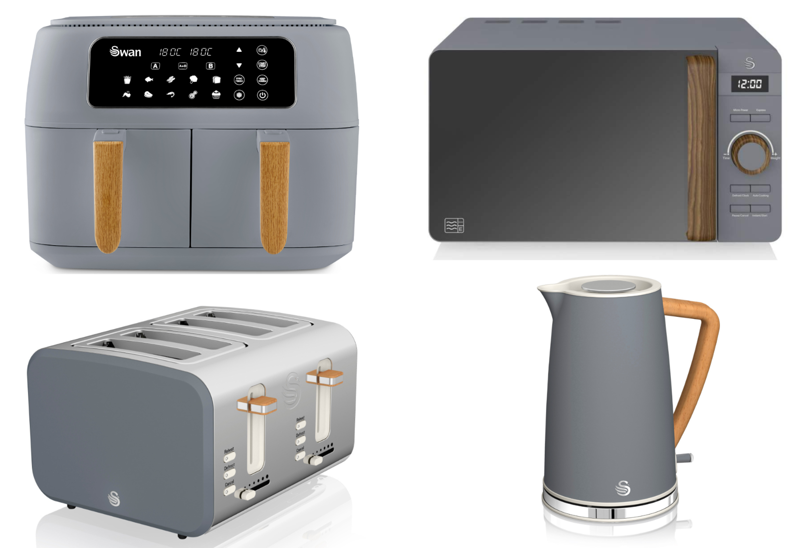 Brand New Swan Nordic Grey 1.7L Jug Kettle, 4 Slice Toaster, 8L Dual Basket 13-in-1 Air Fryer & 800W 20L Microwave. Scandinavian Inspired Minimalist Design Matching Kitchen Set in Grey with Wood Effect Accents
