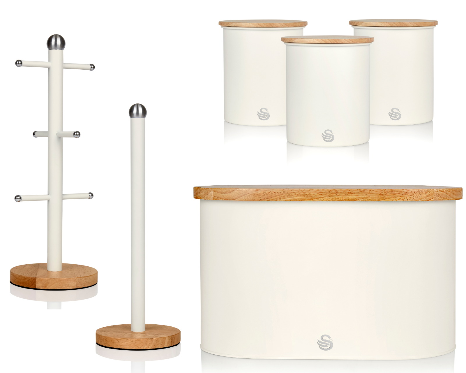 Swan Nordic White Kitchen Storage Set with Bread Bin Canisters Mug Tree & Towel Pole