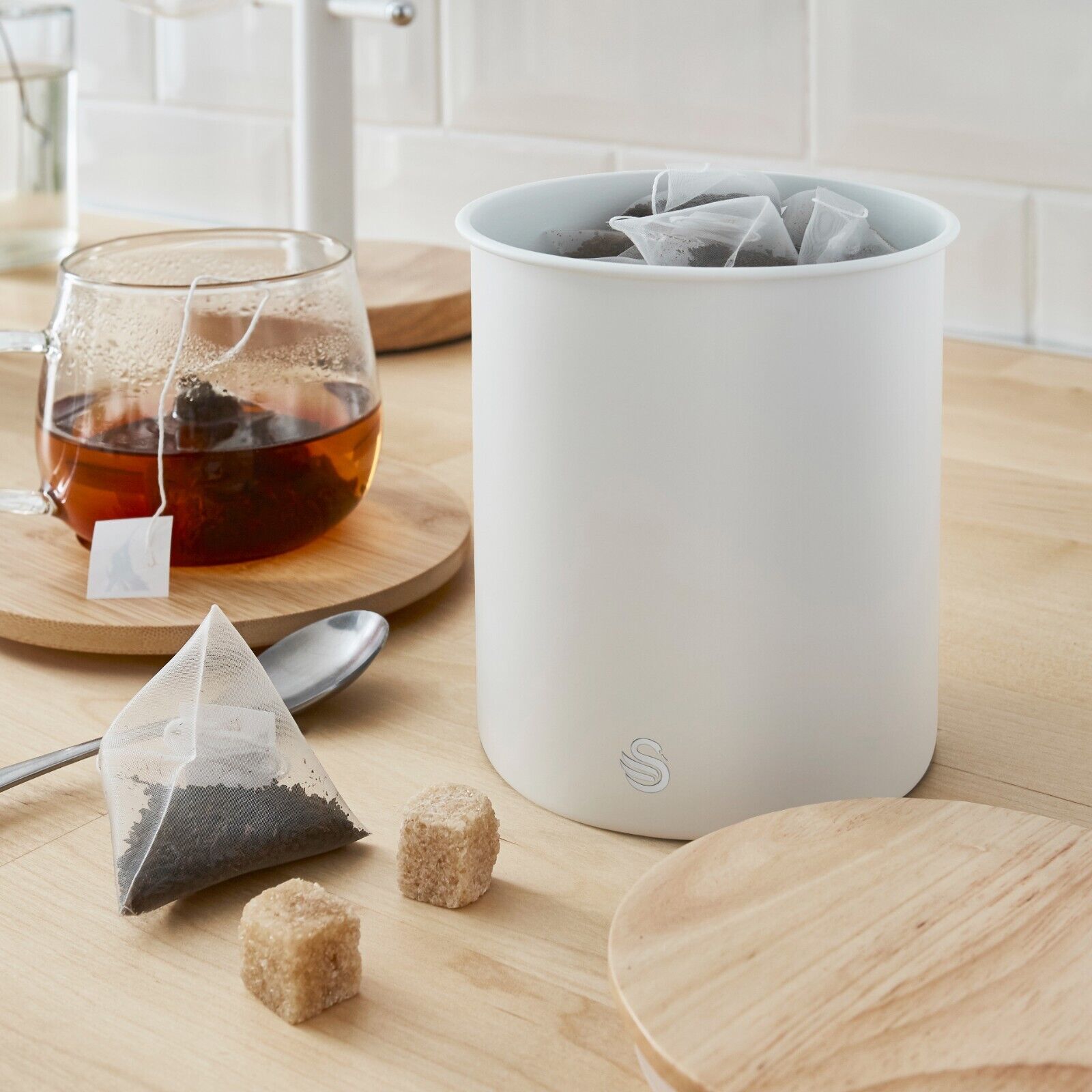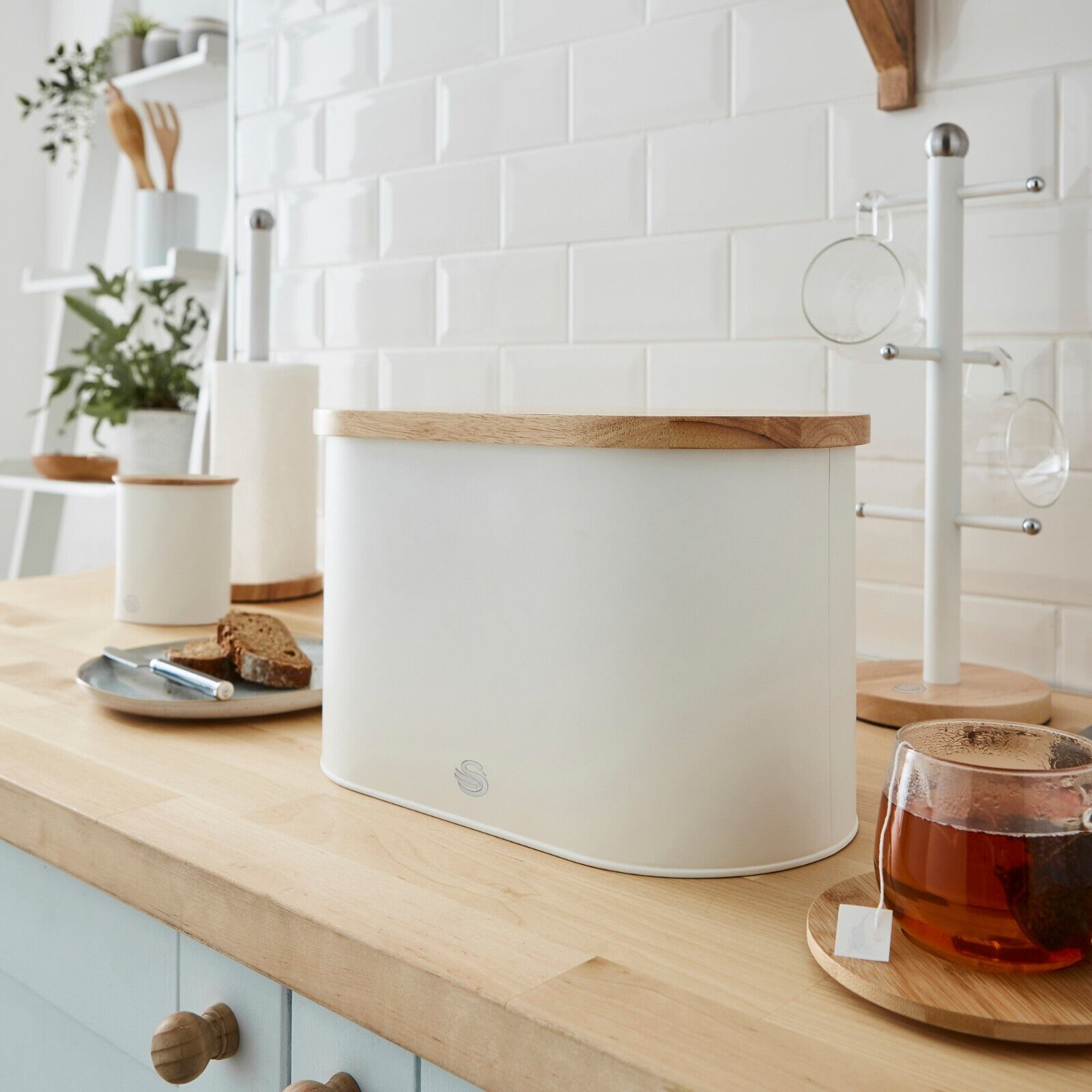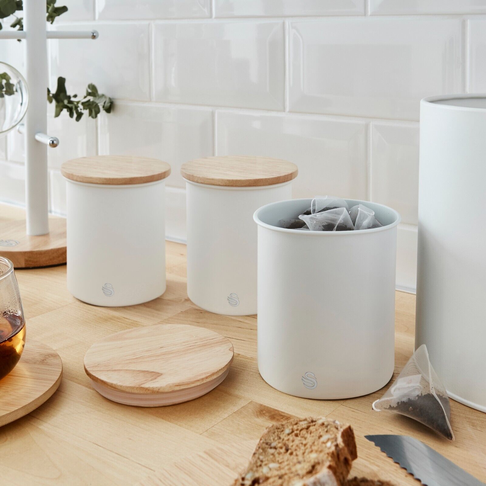Swan Nordic White Kitchen Storage Set with Bread Bin, Tea, Coffee & Sugar Canisters, Mug Tree & Towel Pole. Matching Kitchen Storage Set of 6. Scandinavian Minimalist Design