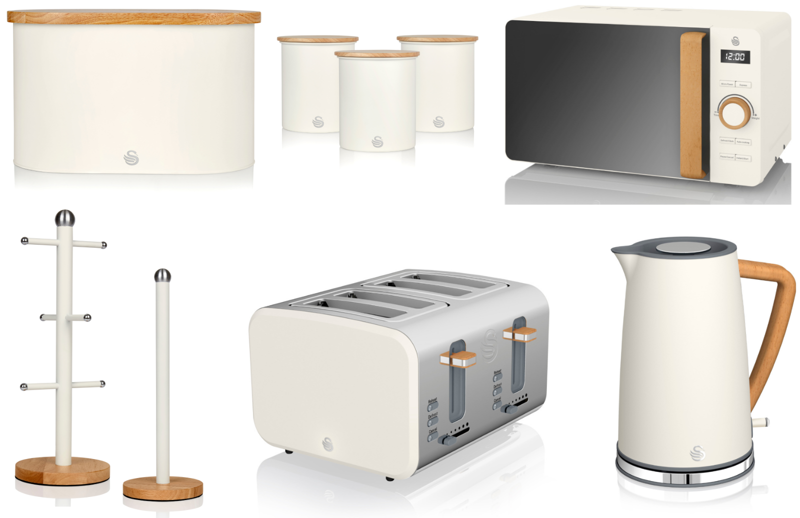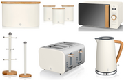 Swan Nordic Style Kitchen Set of 9 in Cotton White including 1.7L Jug Kettle, 4 Slice Toaster, 800W 20L Microwave, Bread Bin & Tea, Coffee, Sugar Canisters, 6 Cup Mug Tree & Towel Pole