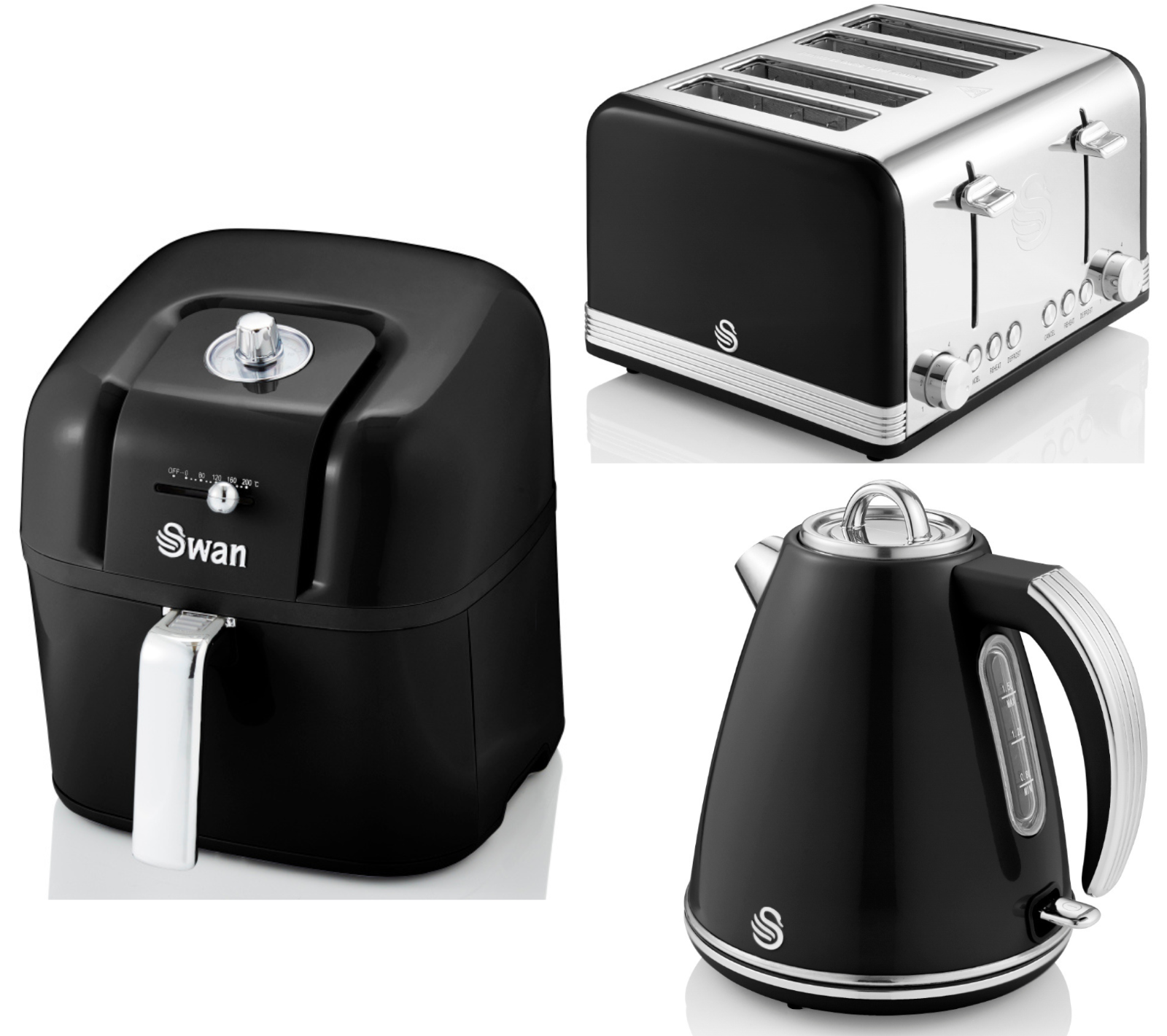 Swan Retro Black 1.5L 3KW Jug Kettle, 4 Slice Toaster & 6L Air Fryer Matching Retro Design Kitchen Set in Black