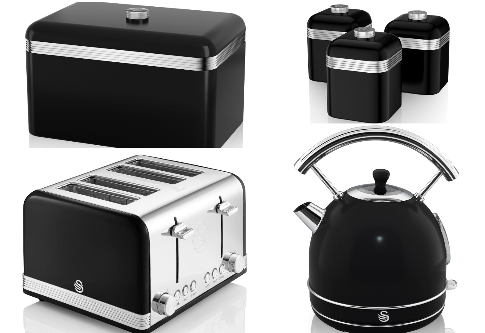Swan Retro Black Dome Kettle 4 Slice Toaster Bread Bin & Canisters Kitchen Set