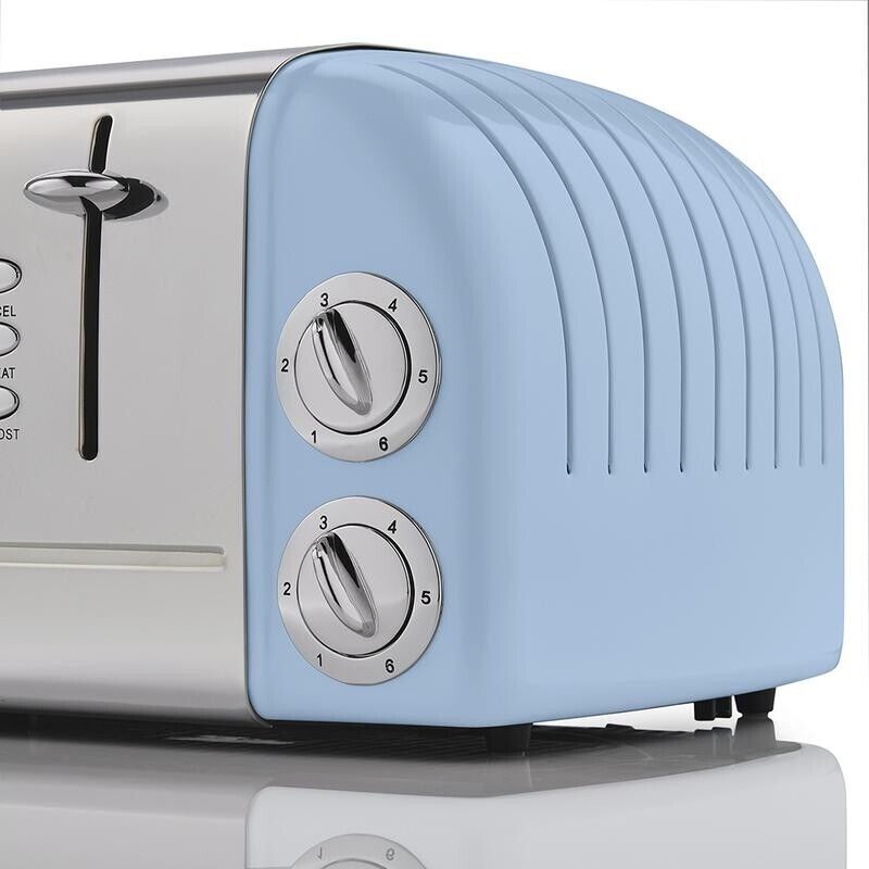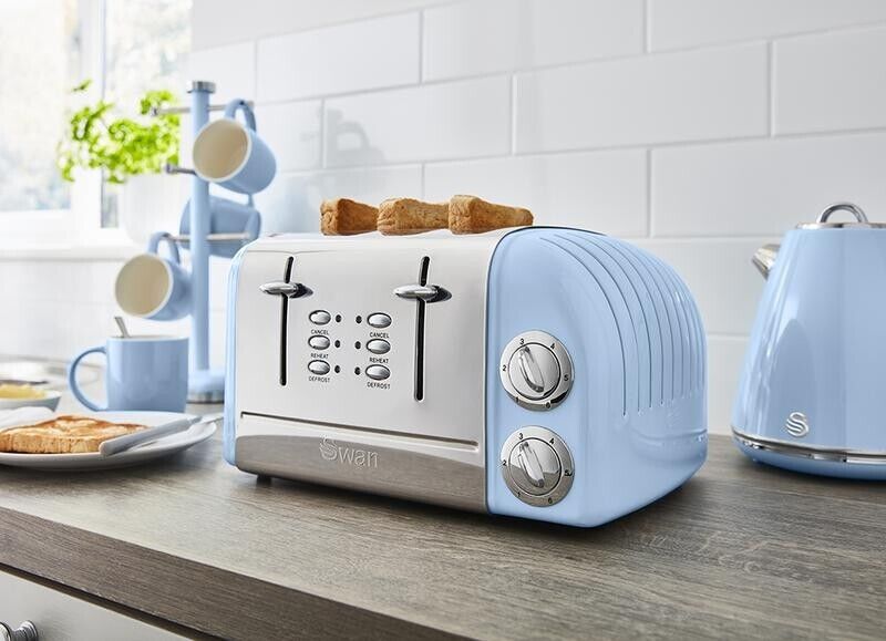Introduce Swan 4 Slice Retro Toaster to breakfast time! With a cool retro design and 4 slice capacity, it's ideal for the morning breakfast rush.The Swan Retro 4-slice toaster is perfect for the morning breakfast rush! With a generous 4 slice capacity, there is extra space for little mouths and makes romantic breakfasts in bed effortless and easy. Featuring 4 wide slots this Retro toaster can accommodate bread of all sizes, crumpets, bagels, muffins and more. Self-centering slots provide an all-round even browning, whilst the slide-out crumb tray makes for an effortless clean up! Independent electronic browning control ensures your bread is toasted perfectly every time. The high-lift function makes it easier and safer to remove your bread after it has toasted. Handy defrost, reheat and cancel buttons allow for versatile use. So, you can toast straight from frozen or reheat toast without cooking it further.
