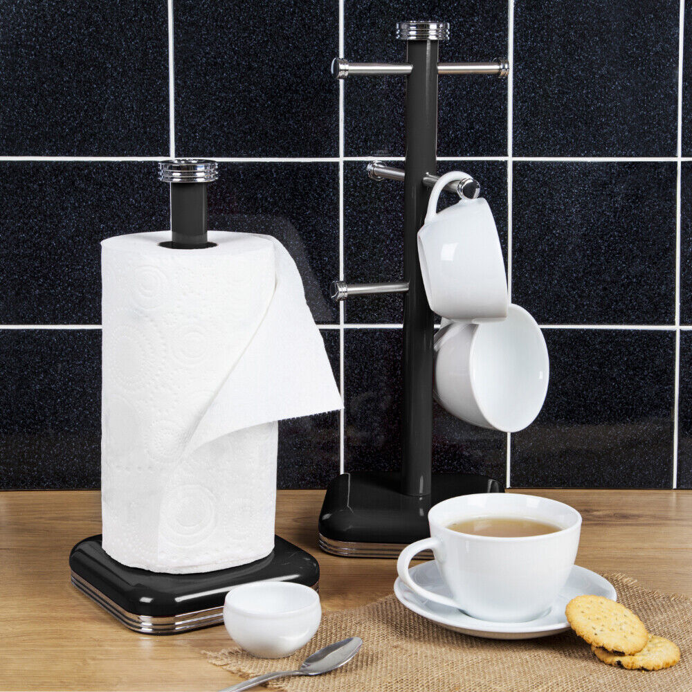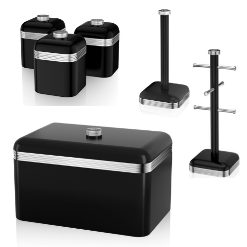 SWAN Retro Black Bread Bin Canisters, Mug Tree & Towel Pole Kitchen Storage Set