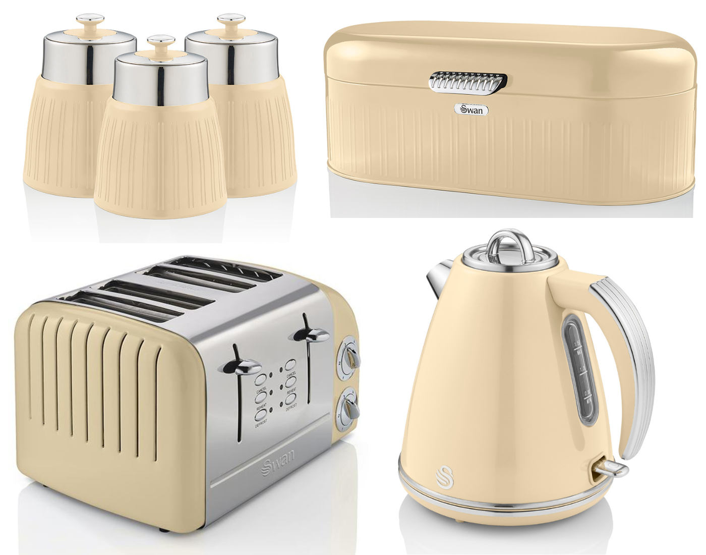Brand New Swan Retro Kitchen Set of 6 in Cream including 1.5L 3KW Jug Kettle, 4 Slice Toaster, Bread Bin, & Tea, Coffee, Sugar Canisters. Vintage Matching Kitchen Set in Cream