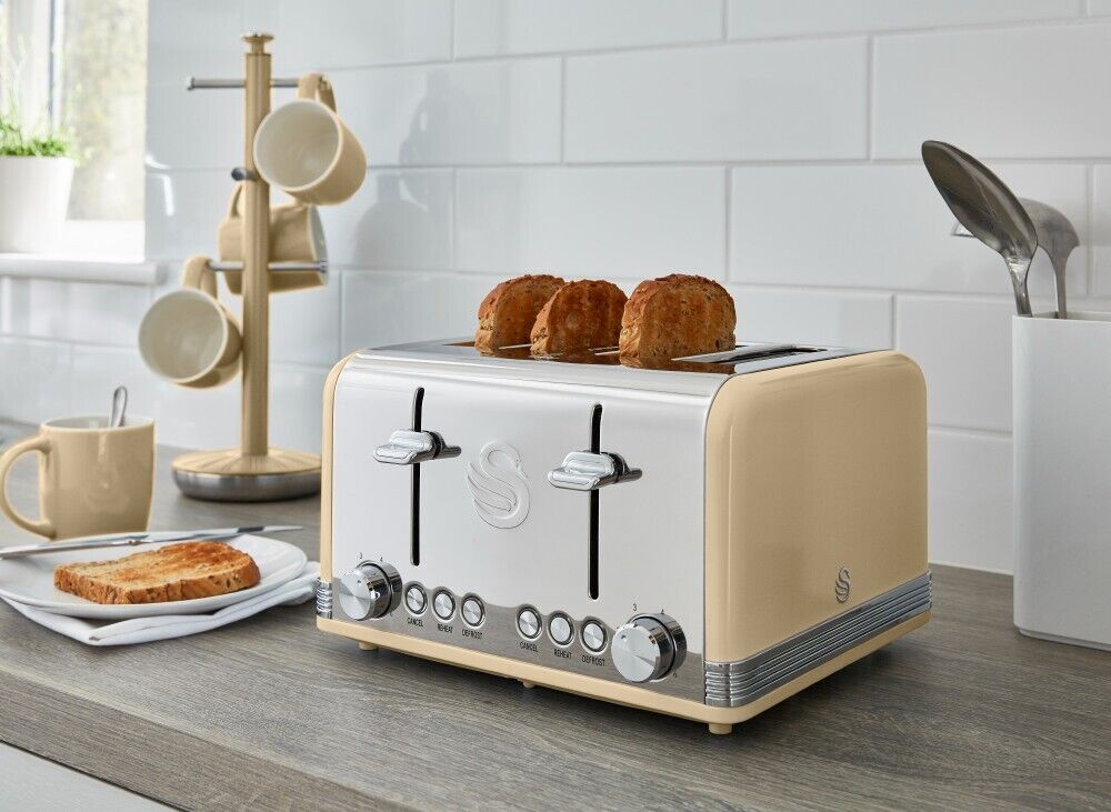 Count on the Swan Retro 4-Slice Toaster for perfectly browned bread every morning. Along with 1600 watts of power, this stylish kitchen appliance has defrost and reheat functions, plus a warming rack, giving you many options on how to prepare your favourite breads. A high-lift eject button ensures your fingers stay safe while automatic shut-off and red indicator lights help keep your toast from burning.