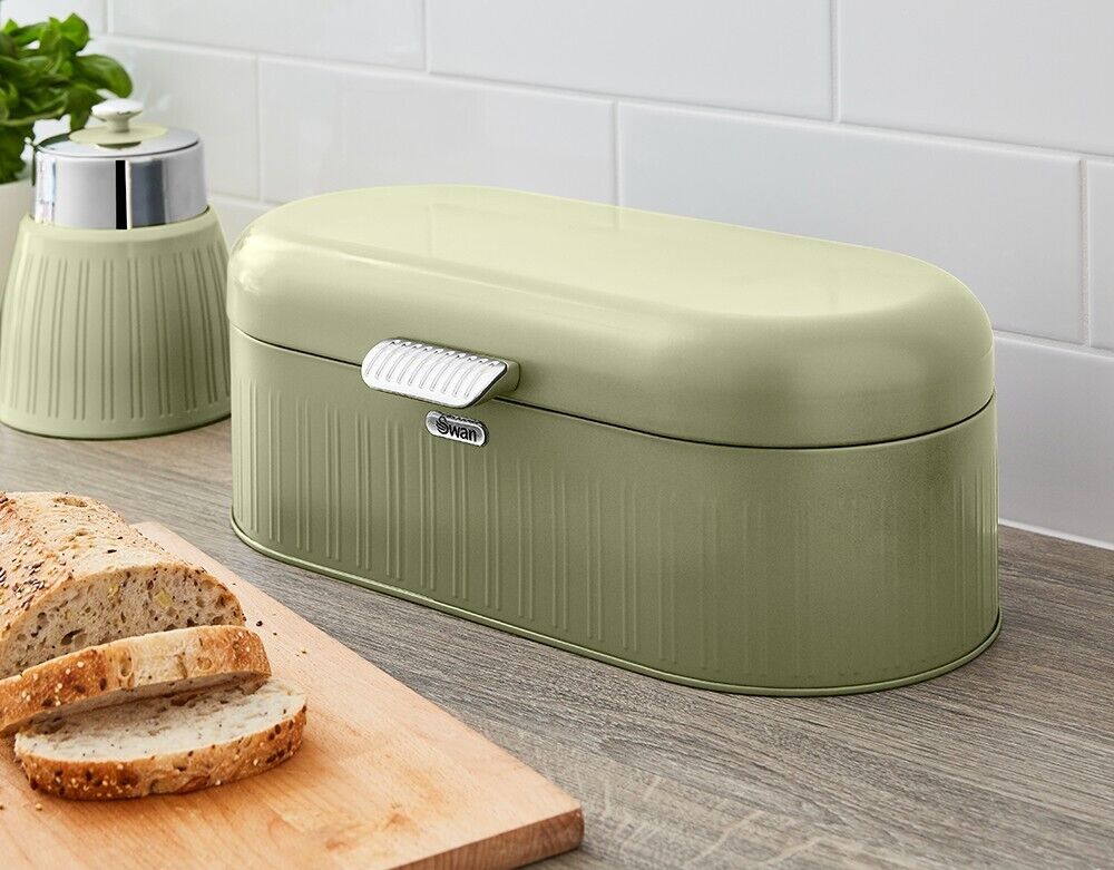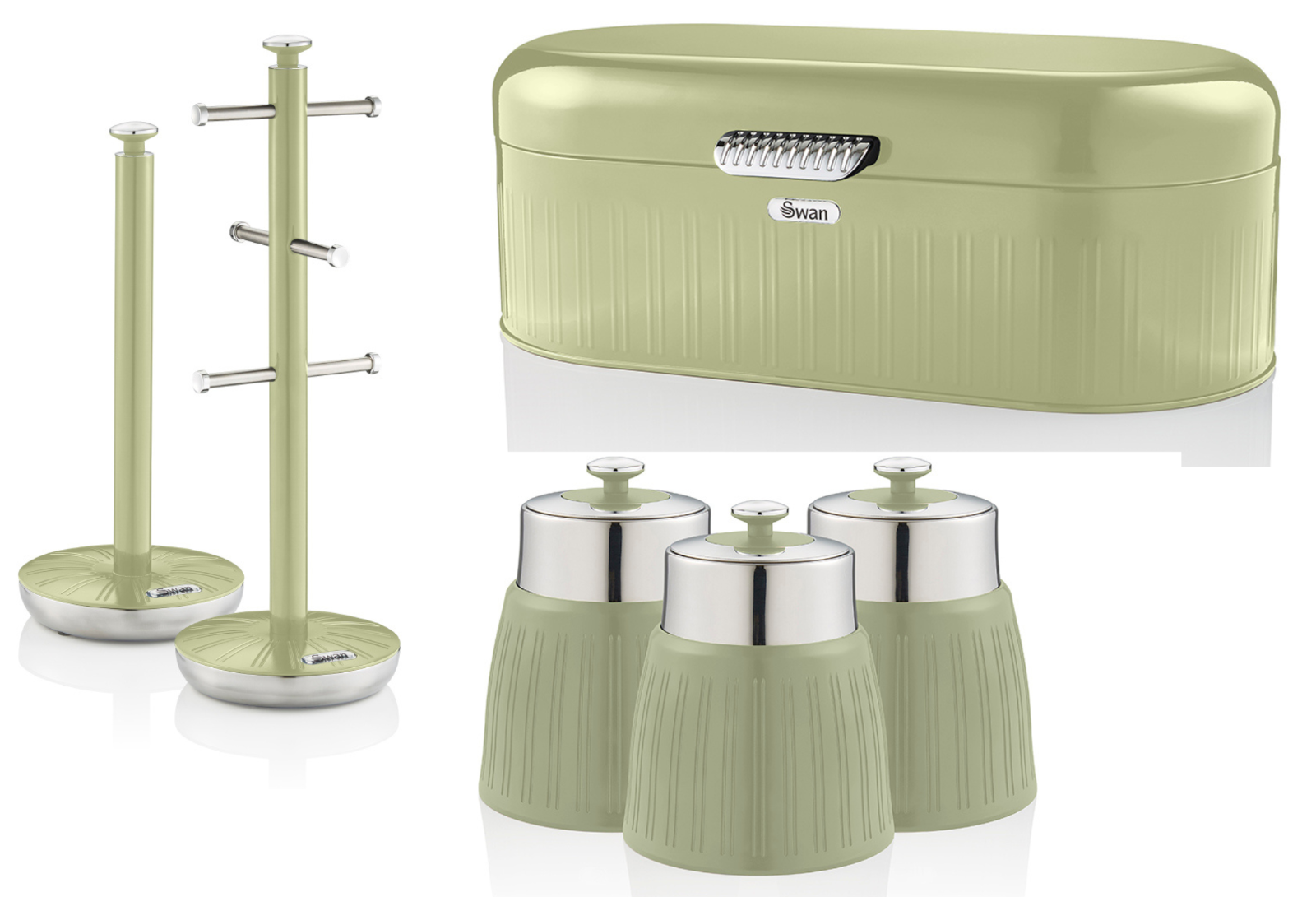 Brand New Swan Retro Bread Bin, Set of 3 Tea, Coffee & Sugar Canisters, Mug Tree & Towel Pole Matching Kitchen Storage Set of 6 in Vintage Green