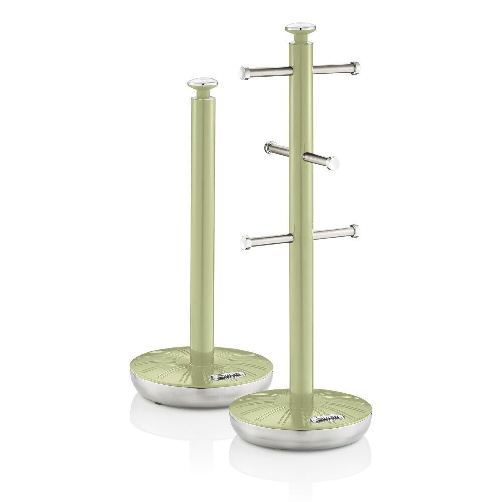Swan Retro Green Bread Bin 3 Canisters Mug Tree & Towel Pole Kitchen Storage Set