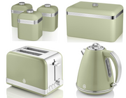 Brand New Swan Retro Set of 6 in Green including 1.5L 3KW Jug Kettle, 2 Slice Toaster, Bread Bin, Set of 3 Tea, Coffee, Sugar Canisters. Retro Design Kitchen Set