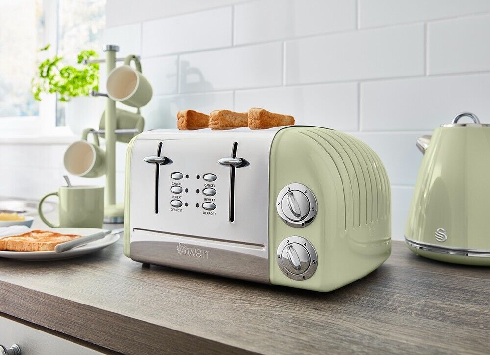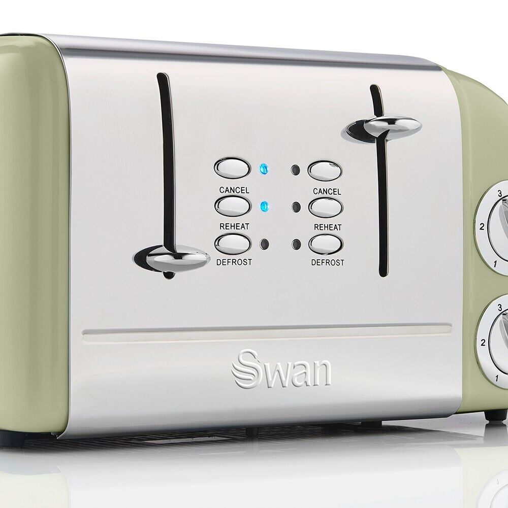 Introducing the Swan 4 Slice Retro Toaster to breakfast time! With a cool retro design and 4 slice capacity, it's ideal for the morning breakfast rush.The Swan Retro 4-slice toaster is perfect for the morning breakfast rush! With a generous 4 slice capacity, there is extra space for little mouths and makes romantic breakfasts in bed effortless and easy. Featuring 4 wide slots this Retro toaster can accommodate bread of all sizes, crumpets, bagels, muffins and more. Self-centering slots provide an all-round even browning, whilst the slide-out crumb tray makes for an effortless clean up! Independent electronic browning control ensures your bread is toasted perfectly every time. The high-lift function makes it easier and safer to remove your bread after it has toasted. Handy defrost, reheat and cancel buttons allow for versatile use. So, you can toast straight from frozen or reheat toast without cooking it further.
