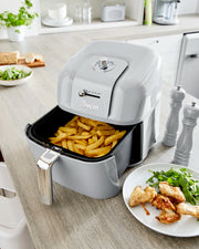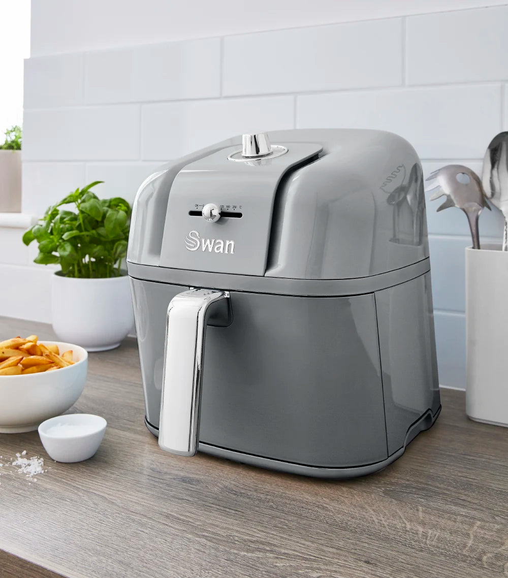 Want the delicious taste of fried foods but much healthier? The Swan Retro Manual Air Fryer uses little to no oil when frying food for the same great taste with up to 80 per cent less fat. This air fryer combines style and functionality with its cool retro-inspired design it makes a beautiful addition to any kitchen. Its generous 6 litre capacity means you can fry enough food for the whole family, quickly and easily. The chrome Swan knobs allows you to choose your temperature and time, so you can cook a variety of foods with little effort. The auto-stop function and count-down memory allow you to keep an eye on your frying by pulling out the pan, and once you place it back in, it picks up where it left off. The built-in safe start sensor means the fryer won't work unless the pan is in and placed properly, ensuring your safety. Its so simple and easy to use! The pan can be removed and inside is a detachable non-stick cooking tray for easy serving of food and quick cleaning, just place it in the dishwasher.