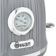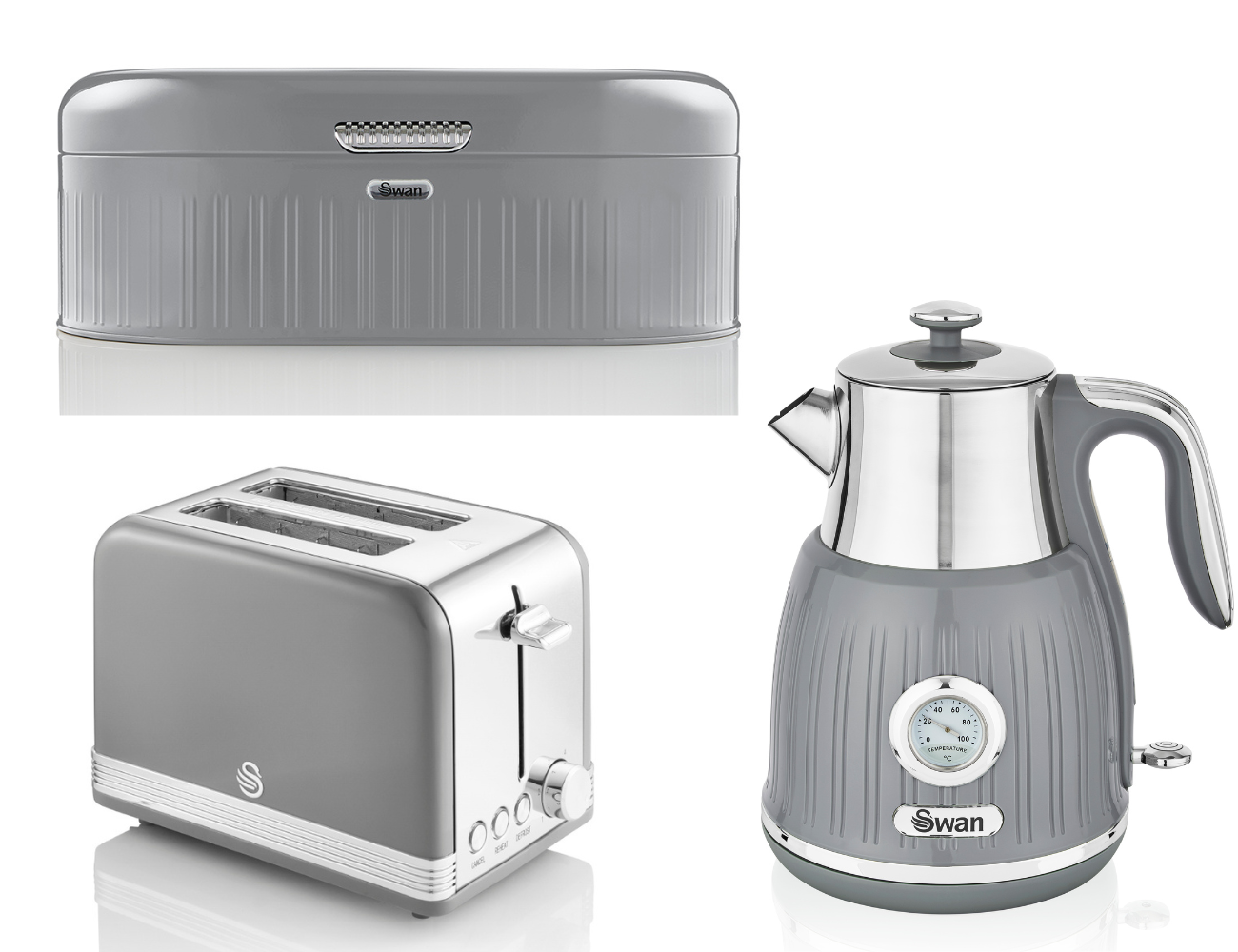 Brand New Swan Retro Kitchen Set of 3 in Grey including 1.5L 3KW Jug Temperature Dial Kettle, 2 Slice Toaster & Bread Bin