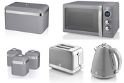 SWAN Retro Grey 1.5L 3KW Jug Kettle, 2 Slice Toaster, 800W Digital Microwave, Bread Bin & Canisters Matching Set